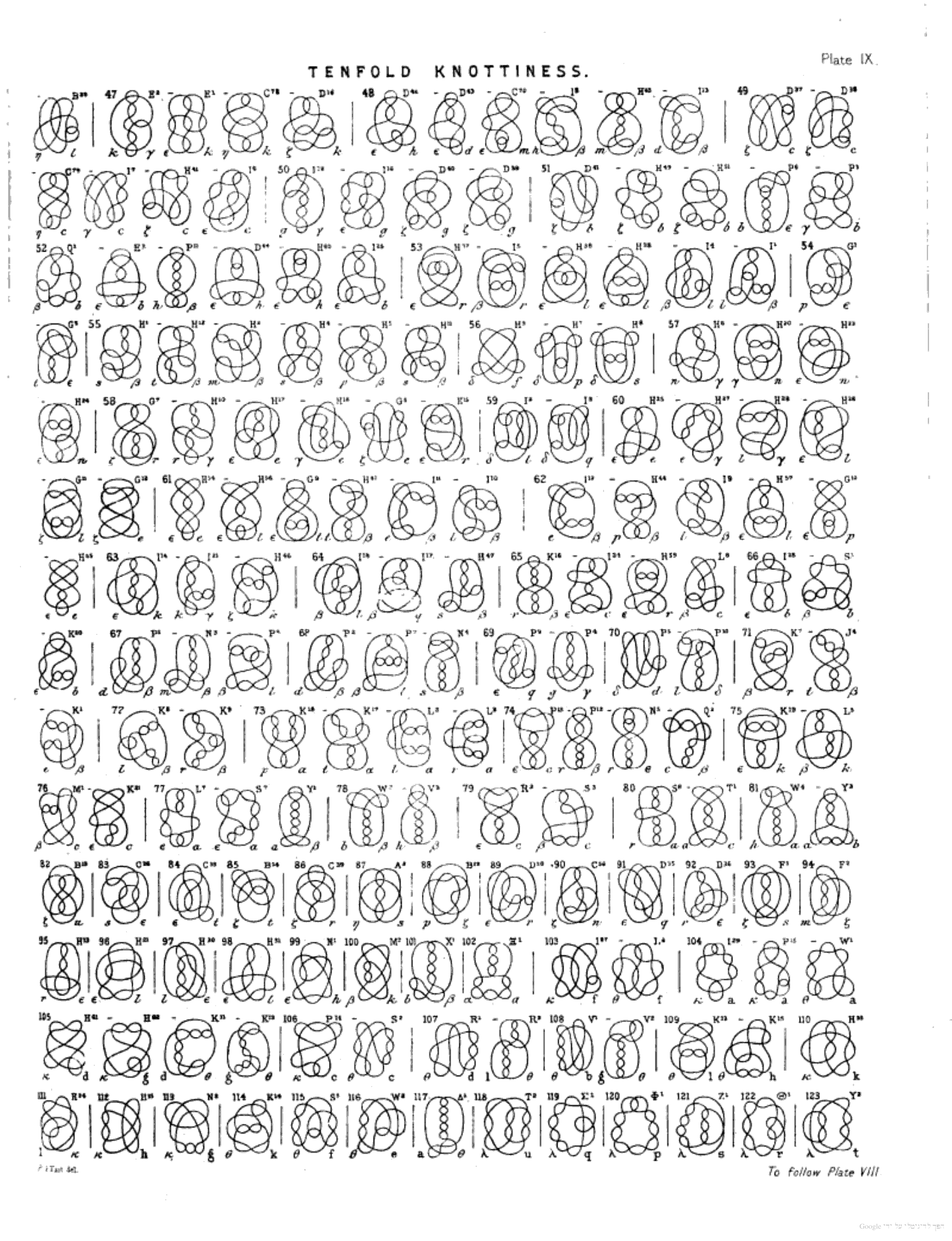이후 1860년대에는 켈빈 경이 원자 소용돌이 이론을 제시했는데, 이는 원자가 에테르라는 가상의 매질 속에서 꼬인 매듭과 같다는 이론이었다. 비록 이 이론은 나중에 받아들여지지 않았지만, 당시 과학자들에게 영감을 주었다. 특히 피터 거스리 테이트는 켈빈 경의 이론에 영향을 받아 매듭들을 체계적으로 분류하려는 시도를 했고, 그 결과 최초의 매듭 표를 만들었다. 테이트는 1885년에 교차점 개수가 최대 10개인 매듭들의 표를 발표했으며, 이와 함께 테이트 추측으로 알려진 여러 수학적 가설을 제시했다. 이러한 초기 연구들은 매듭 이론이 점차 위상수학이라는 더 큰 수학 분야의 일부로 발전하는 계기가 되었다.