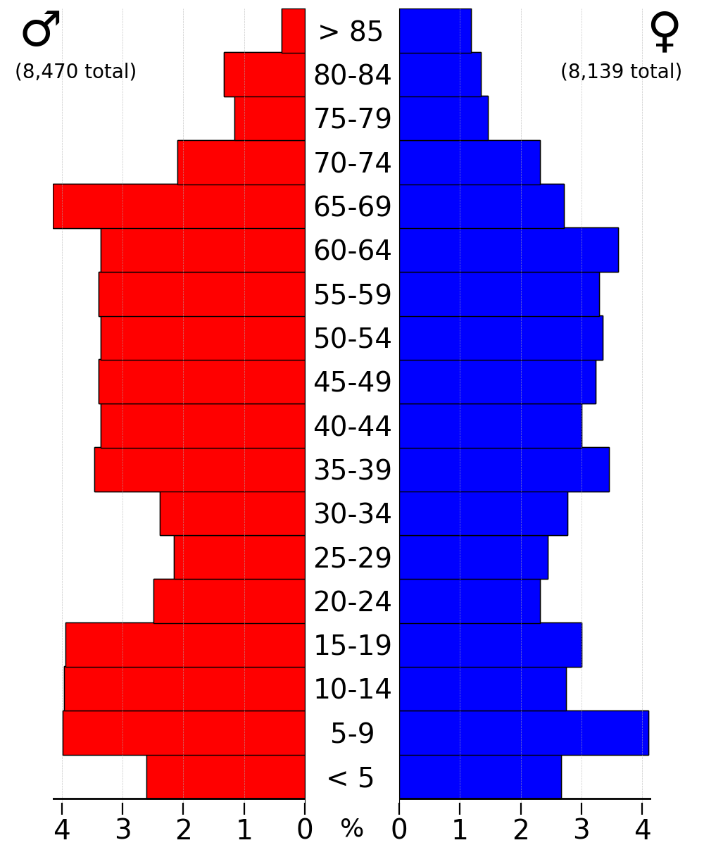 연령 분포는 18세 미만 27.10%, 18세에서 24세 6.90%, 25세에서 44세 27.40%, 45세에서 64세 23.40%, 65세 이상 15.20%였다. 중앙값 연령은 38세였다. 여성 100명당 남성은 97.40명이었다. 18세 이상 여성 100명당 남성은 93.10명이었다.