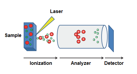 매트릭스 보조 레이저 탈착 이온화 비행 시간형 질량 분석기 기기 다이어그램. 복사 에너지에 의해 이온화된 시료 매트릭스가 표면에서 방출된다. 시료는 질량 분석기로 이동하여 실질적으로 검출된다.