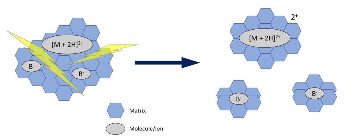 레이저는 건조된 액적 지점의 매트릭스 결정에 조사된다. 매트릭스는 레이저 에너지를 흡수하며, 주로 매트릭스가 탈착되고 (양성자 부가에 의해) 이온화된다.[38] 절제 과정에서 생성된 뜨거운 플룸은 중성 및 이온화된 매트릭스 분자, 양성자화 및 탈양성자화된 매트릭스 분자, 매트릭스 클러스터 및 나노액적 등 여러 종류의 물질을 포함한다. 절제된 물질은 분석물의 이온화에 관여할 수 있지만, MALDI의 메커니즘은 여전히 논쟁의 대상이다. 일반적으로 매트릭스는 양성자를 분석물 분자(예: 단백질 분자)로 전달하여 분석물을 대전시키는 것으로 알려져있다.[38]