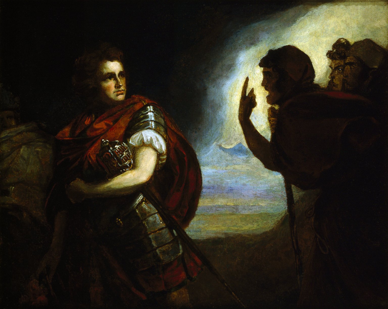 맥베스와 뱅코는 전장에서 돌아오는 길에 황무지에서 세 마녀를 만난다.[1] 마녀들은 맥베스에게 글래미스 영주, 코더 영주를 거쳐 왕이 될 것이라고 예언하고, 뱅코에게는 왕의 아버지가 될 것이라고 예언한다.[1] 맥베스는 이 예언에 사로잡혀 "그것에 사로잡혀", "우리 동료가 어떻게 사로잡히는지 보라"와 같이 묘사될 정도로 강한 집착을 보인다.[1] '사로잡힌'이라는 단어는 맥베스가 마녀의 예언에 얼마나 유혹당하는지를 보여준다.[1] 마녀들이 떠나려 할 때, 맥베스는 "더 말해봐"라고 외치며 그들의 능력에 관심을 보인다.[1] 심지어 아내에게 보낸 편지에서 "그들에게 더 질문하기를 열망했다"라고 쓸 정도였다.[1]