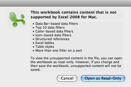 맥용 마이크로소프트 오피스 2008은 윈도우 버전과 기능적 동등성을 갖추지 못했다. Excel에서 VBA 지원이 부족하여 VBA로 프로그래밍된 매크로를 사용할 수 없다. 마이크로소프트 측은 Xcode에 VBA 지원을 추가하면 오피스 2008 개발 주기가 2년 더 늘어났을 것이라고 설명했다.[12] 지원되지 않는 다른 기능으로는 윈도우용 Word 2007에서 생성된 OMML 수식,[13] 오피스의 "리본" 인터페이스, 미니 툴바, 실시간 미리 보기 및 윈도우 버전과 동등한 SharePoint 통합 등이 있다. Mac용 Excel 2008에서는 데이터 필터(데이터 막대, 상위 10개, 색상 기반, 아이콘 기반), 구조화된 참조, Excel 표, 표 스타일, 세 개 이상의 열을 한 번에 정렬할 수 있는 기능, 정렬 시 둘 이상의 필터 사용 등 일부 기능이 누락되었다.