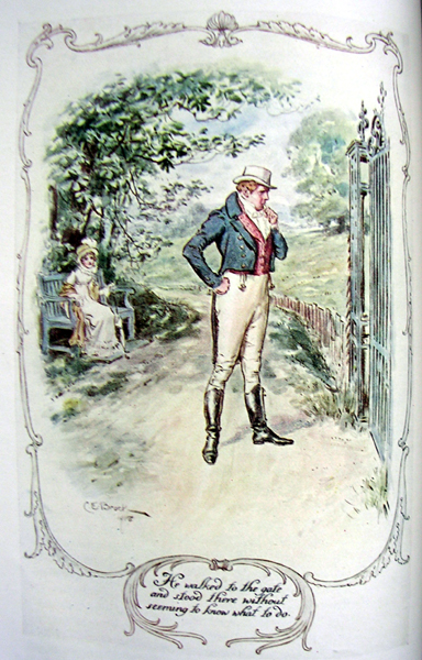 당황한 러쉬워스 씨가 소턴 코트의 하하(ha-ha)에 있는 잠긴 문을 바라보는 모습 (C. E. 브록 삽화) - 연극 ''연인의 서약'' 공연 시도 (13-20장): 젊은이들이 토머스 경의 부재를 틈타 당시 사회적으로 논란이 될 수 있는 내용의 연극을 공연하려 하는 것은 기존 질서와 권위에 대한 도전, 그리고 연극 연습 과정에서 드러나는 등장인물들의 숨겨진 욕망과 부적절한 관계(특히 헨리와 마리아)를 상징한다. 에드먼드의 반대와 토머스 경의 분노는 도덕적, 사회적 규범의 중요성을 강조한다.