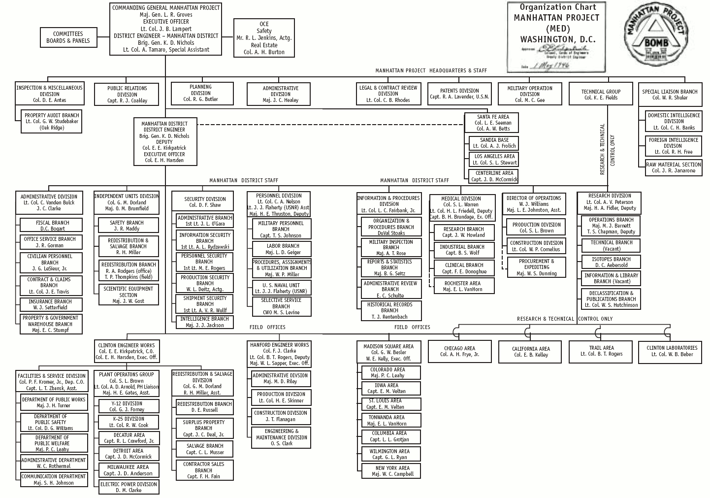 이후 서머벨과 스타일러는 군사 정책 책임자로 그로브스를 선정하고 11월 17일 마셜 장군에게 이를 통지하였으며, 마셜 장군은 그로브스를 준장에 임명하였다.[397] 이후 과학자들은 맨해튼 계획의 총책인 그로브스를 "장군"이라고 불렀다.[398] 그로브스는 워싱턴 D.C. 해리 S. 트루먼 빌딩 5층에 본부를 두었다.[399]