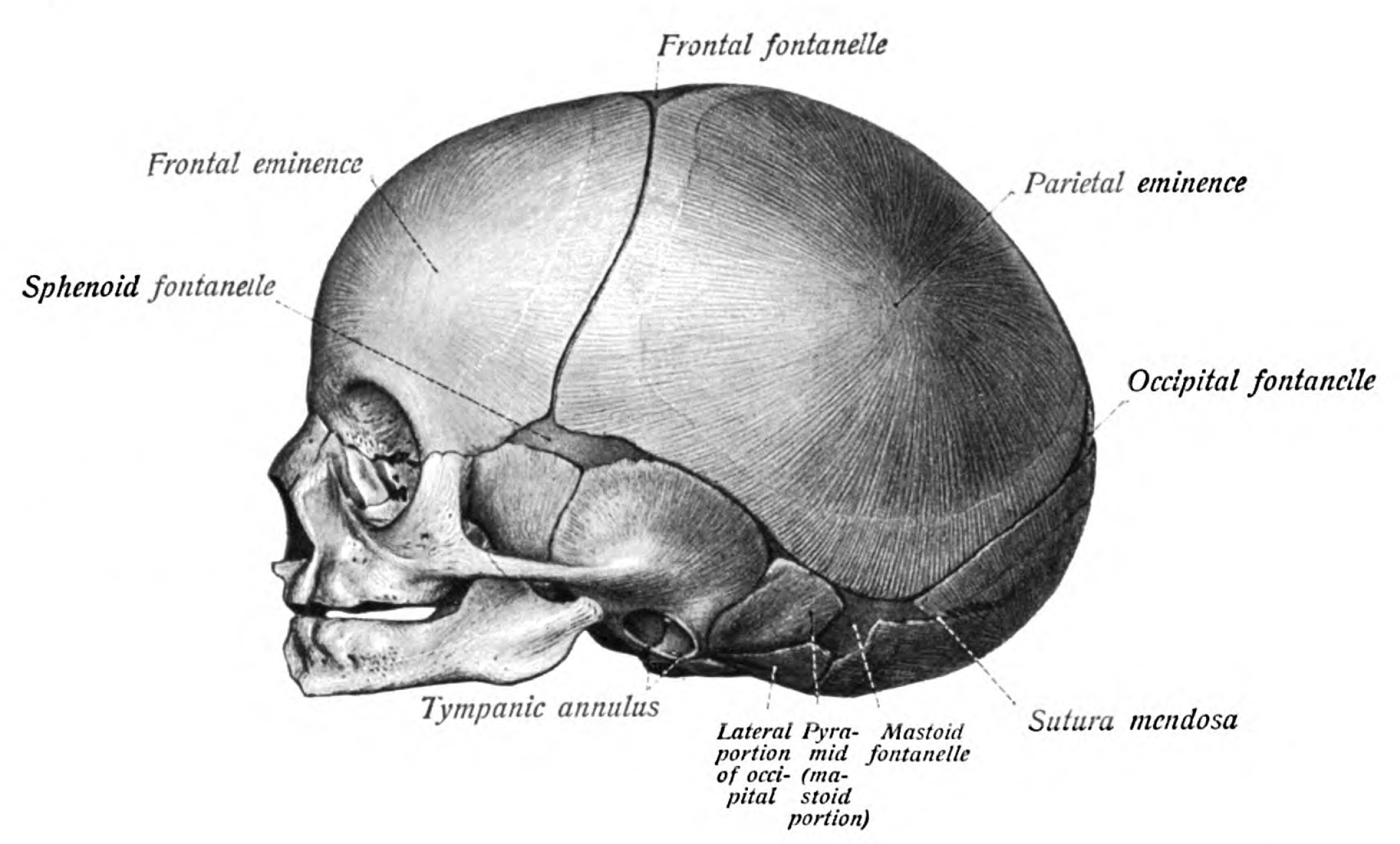 출생 시 인간의 머리뼈는 44개의 개별적인 뼈 요소로 구성된다. 발달하는 동안, 이 뼈 요소들 중 상당수는 점차적으로 융합되어 단단한 뼈가 된다(예: 전두골). 머리덮개뼈는 처음에는 결합 조직이라고 불리는 조밀한 영역에 의해 분리되어 있다. 천문은 6개가 있는데, 앞쪽(또는 전두), 뒤쪽(또는 후두), 두 개의 접형골(또는 앞쪽 가쪽), 두 개의 유양돌기(또는 뒤쪽 가쪽)이다. 출생 시 이러한 부위는 섬유성이며 움직일 수 있어 출산과 이후 성장에 필요하다. 이러한 성장은 비늘과 후두골의 가쪽 부분이 만나는 "산부인과적 경첩"에 많은 양의 긴장을 가할 수 있다. 이 긴장의 가능한 합병증은 대뇌정맥의 파열이다.[13] 성장과 골화가 진행됨에 따라 천문의 결합 조직은 뼈로 대체되어 봉합을 생성한다. 5개의 봉합은 2개의 비늘봉합, 1개의 관상봉합, 1개의 시옷봉합, 1개의 시상봉합이다. 후두 천문은 보통 8주 이내에 닫히지만, 전두 천문은 최대 18개월까지 열려 있을 수 있다. 전두 천문은 전두골과 두정골의 접합부에 위치하며, 아기의 이마에 있는 "부드러운 부분"이다. 주의 깊게 관찰하면 전두 천문을 통해 부드럽게 맥박이 뛰는 것을 관찰하여 아기의 심박수를 셀 수 있다.[14]