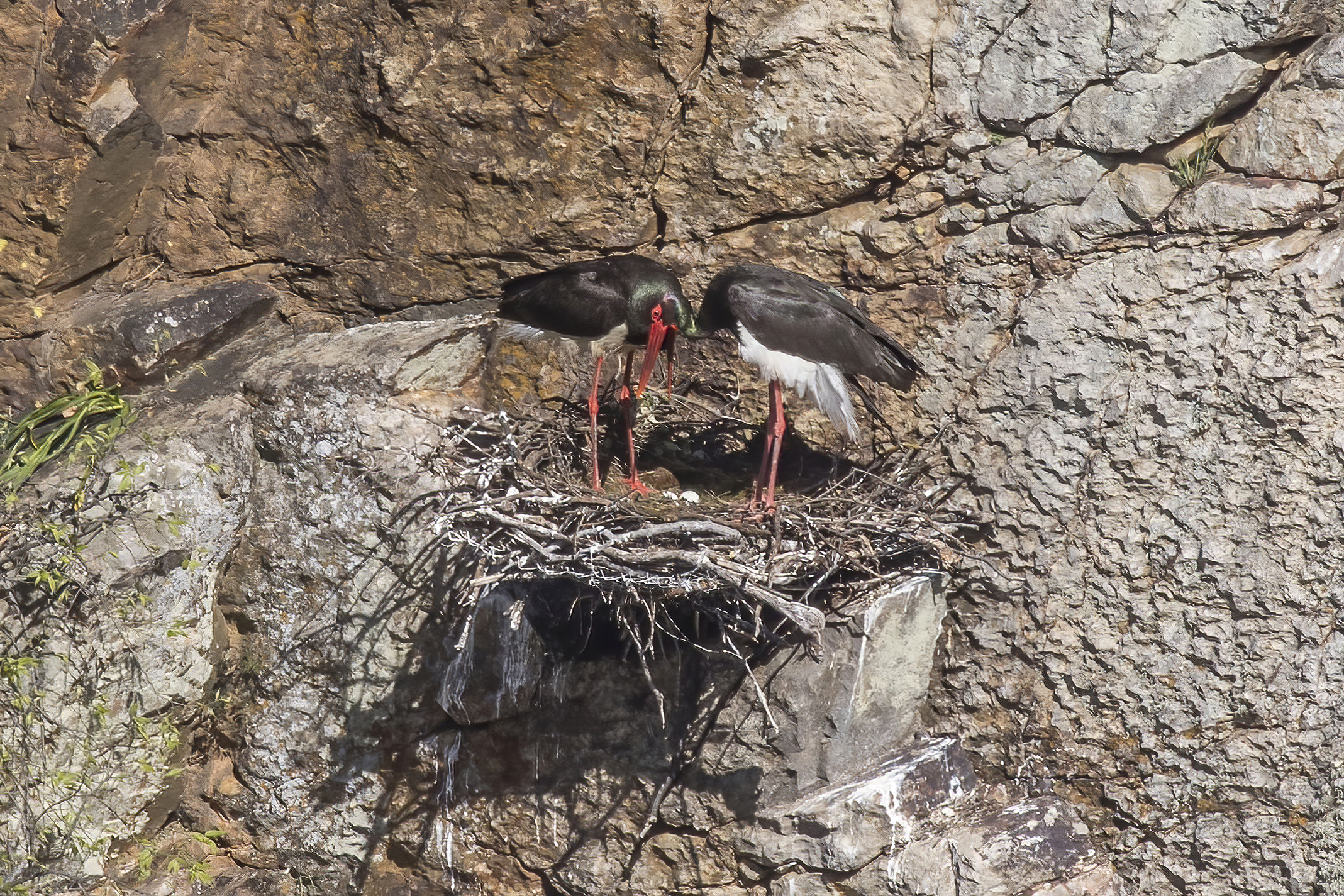 스페인, 남아프리카, 카르파티아 산맥과 같은 가파른 산악 지역에서는 절벽, 큰 바위, 동굴, 돌출된 선반 아래에 둥지를 짓는다. 검은 황새의 외로운 둥지는 종이 많더라도 일반적으로 최소 1 km 이상 떨어져 있다. 새로 지은 둥지는 상당히 작을 수 있지만, 오래된 둥지는 지름이 1m 에서 2m일 수 있다. 남부 아프리카에서 검은 황새는 망치머리새(''Scopus umbretta'') 또는 베로 독수리(''Aquila verreauxi'')와 같은 다른 조류 종의 둥지를 차지할 수 있으며, 다음 해에도 흔히 재사용한다.[1] 둥지는 흙과 풀로 수리하고, 잎, 이끼, 풀, 동물의 털, 종이, 점토 및 헝겊으로 덮여 있다.[22][38]