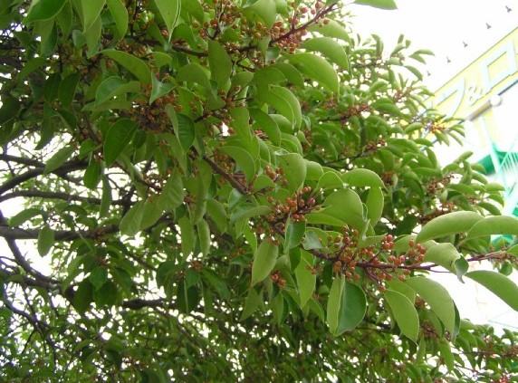 상록활엽수이며 중·고목으로 분류되지만, 자연 상태에서는 보통 10m 정도 자라며 크게 자라지 않는다. 생장 속도는 느린 편이다. 줄기는 하나로 자라며, 통통한 수형을 이룬다. 수피는 녹색을 띤 회백색 또는 회갈색이며, 거의 매끄럽고 작은 피목이 많다. 어린 가지에는 능선이 있으며, 자주색을 띠는 경우가 많다. 일년생 가지는 갈색을 띤다.
