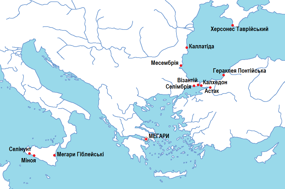 메가라는 역사 초기에는 코린트의 속령이었다. 메가라 사람들은 코린트와의 독립 전쟁을 통해 기원전 685년경 칼케돈, 기원전 667년경 비잔티움을 건설했다. 또한 이들은 시칠리아의 시라쿠사 북쪽에 메가라 휘블라에아(현재 시라쿠사현 아우구스타)라는 도시를 건설했다.
