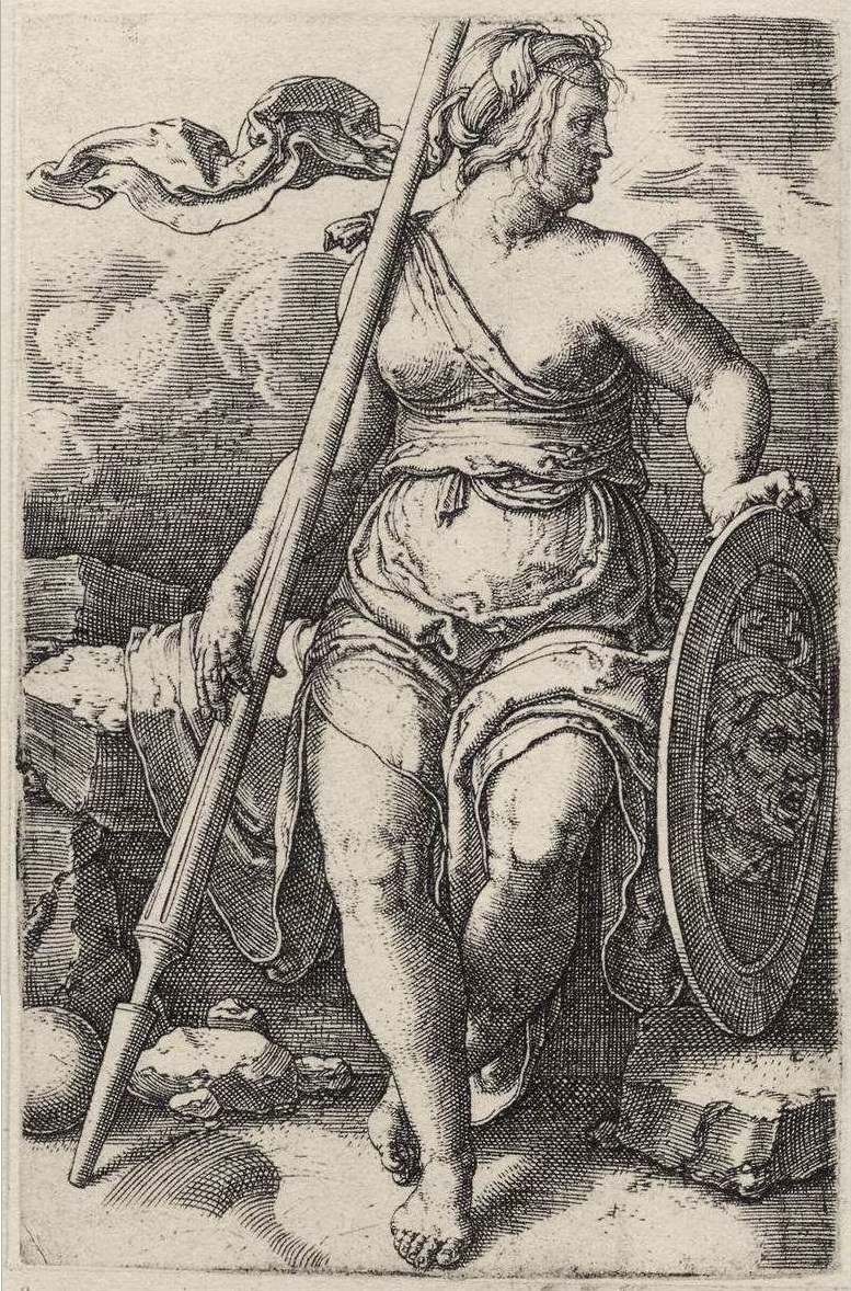 원래 미소녀였던 메두사는 해신 포세이돈과 아테나 신전 중 한 곳에서 정을 통했기 때문에 아테나의 분노를 사 흉측한 괴물이 되었다.[39] 이에 항의한 메두사의 언니들도 괴물이 되었다. 언니인 스테노와 에우뤼알레는 불멸이었지만, 메두사만은 그렇지 않았기 때문에 페르세우스에게 죽임을 당했다고 한다. 아테나는 그녀의 머리를 자신의 아이기스에 박아 넣었다.