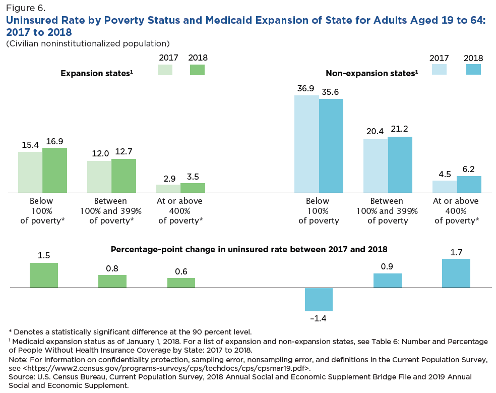 메디케이드를 확대하지 않은 일부 주에서는 소득 자격 기준이 빈곤선의 133%보다 훨씬 낮다.[30] 이러한 주 중 일부는 소득에 관계없이 장애가 없거나 부양 자녀가 없는 비임산부 성인에게는 메디케이드를 제공하지 않는다. 이들은 상업 보험에 대한 보조금도 받지 못하므로, 대부분 의료 보험을 얻을 방법이 거의 없다.[31][32] 예를 들어, 캔자스주에서는 장애가 없고 자녀가 있으며 소득이 빈곤선의 32% 미만인 성인만 메디케이드 자격을 얻을 수 있었고, 빈곤선의 32%에서 100% 사이의 소득(3인 가족 기준 6250USD에서 19530USD)을 가진 사람은 메디케이드와 보험 구매에 대한 연방 보조금 모두 자격이 없었다.[25]