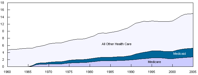 민간 보험 회사의 과점화, 의료 기술의 고도화는 보험료율을 높여, 결과적으로 메디케이드 대상 환자 수는 증가하고 있다. 1990년대에는 전체 인구의 10% 초반이었던 대상자 수는 2000년대에는 20%(4,300만 명)에 달하는 등 증가 추세를 보였다.[143]