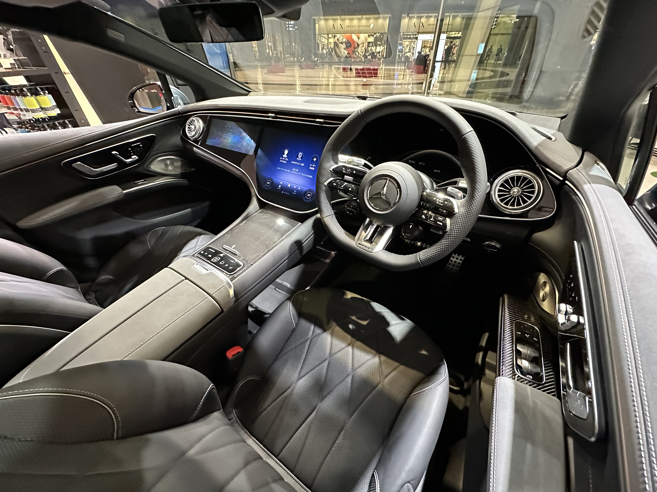 EQS는 럭셔리 자동차로, 뒷바퀴 조향 기능이 기본으로 제공된다.[18] 선택 사양으로 제공되는 "MBUX 하이퍼스크린"은 3장의 고해상도 패널과 대시보드 전체를 1장의 유리로 덮는 와이드 스크린으로 구성되어 있다.[33] 센터 콘솔 하단은 허공에 떠 있는 듯한 구조이며, 좌우 에어 아웃렛은 제트 엔진의 터빈을 본뜬 디자인이다.[33] MBUX AR 내비게이션 및 AR 헤드업 디스플레이도 선택 사양으로 제공된다.[33]