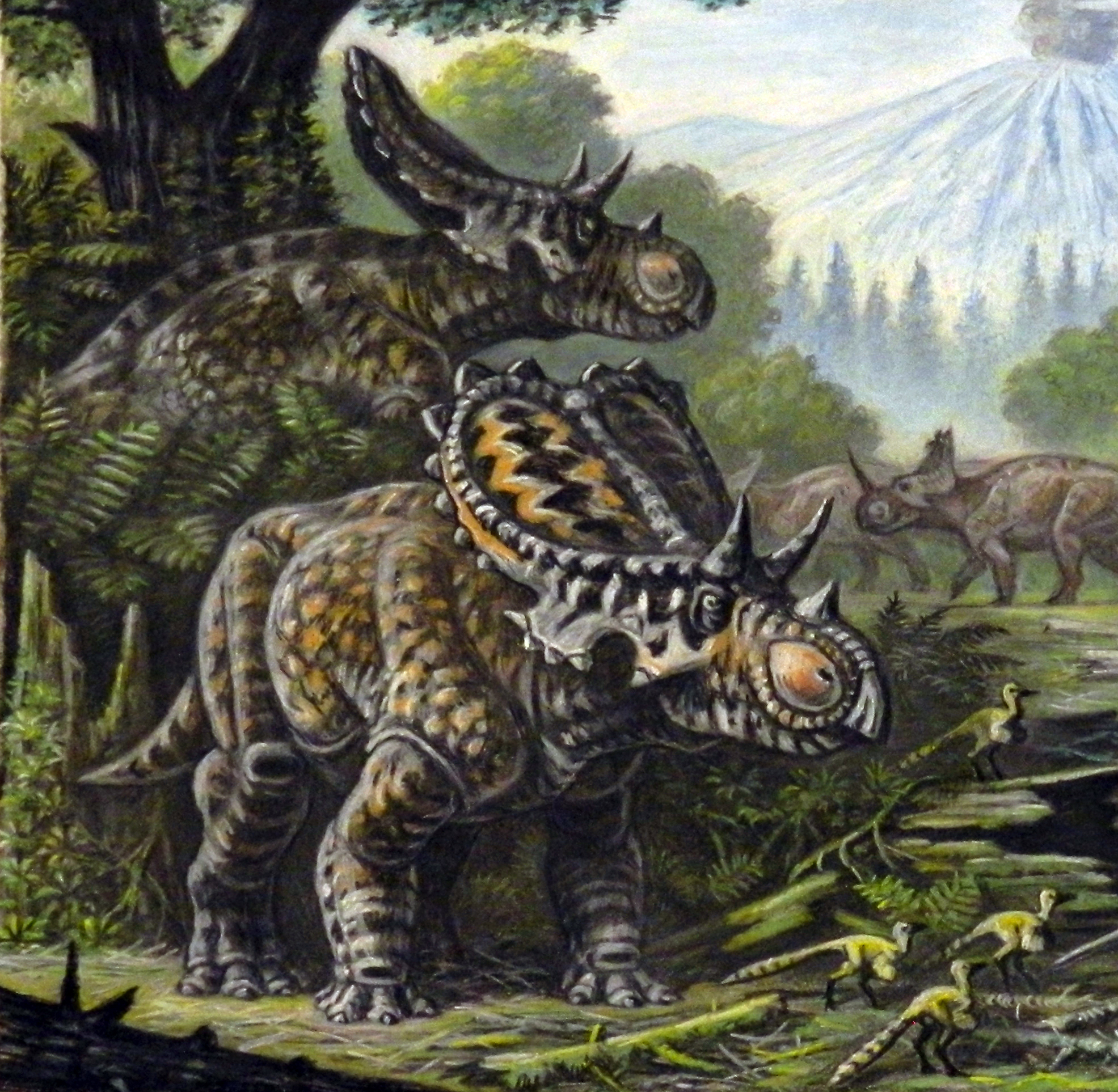 트리케라톱스는 북아메리카에서 발견된 각룡류 공룡의 한 속으로, 거대한 두개골과 뿔이 특징이며 백악기 말기에 번성했고, 현재는 두 종으로 분류된다. - 백악기 후기 북아메리카의 공룡 - 티라노사우루스