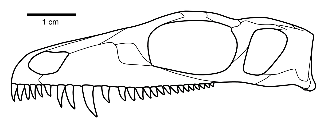 # 첫 번째 전상악 이빨은 두 번째 및 세 번째 이빨보다 작다. 전상악골에는 최대 5개의 이빨이 있다. 첫 번째 이빨은 두 번째 및 세 번째 이빨보다 작지만 마지막 두 개보다 크다. 이 5개의 이빨은 간격이 좁고, 강하게 뒤로 휘어져 있으며, 날카롭게 뾰족하며, 뒤쪽 가장자리의 먼쪽 절반에 날카로운 절단면을 가지고 있다.