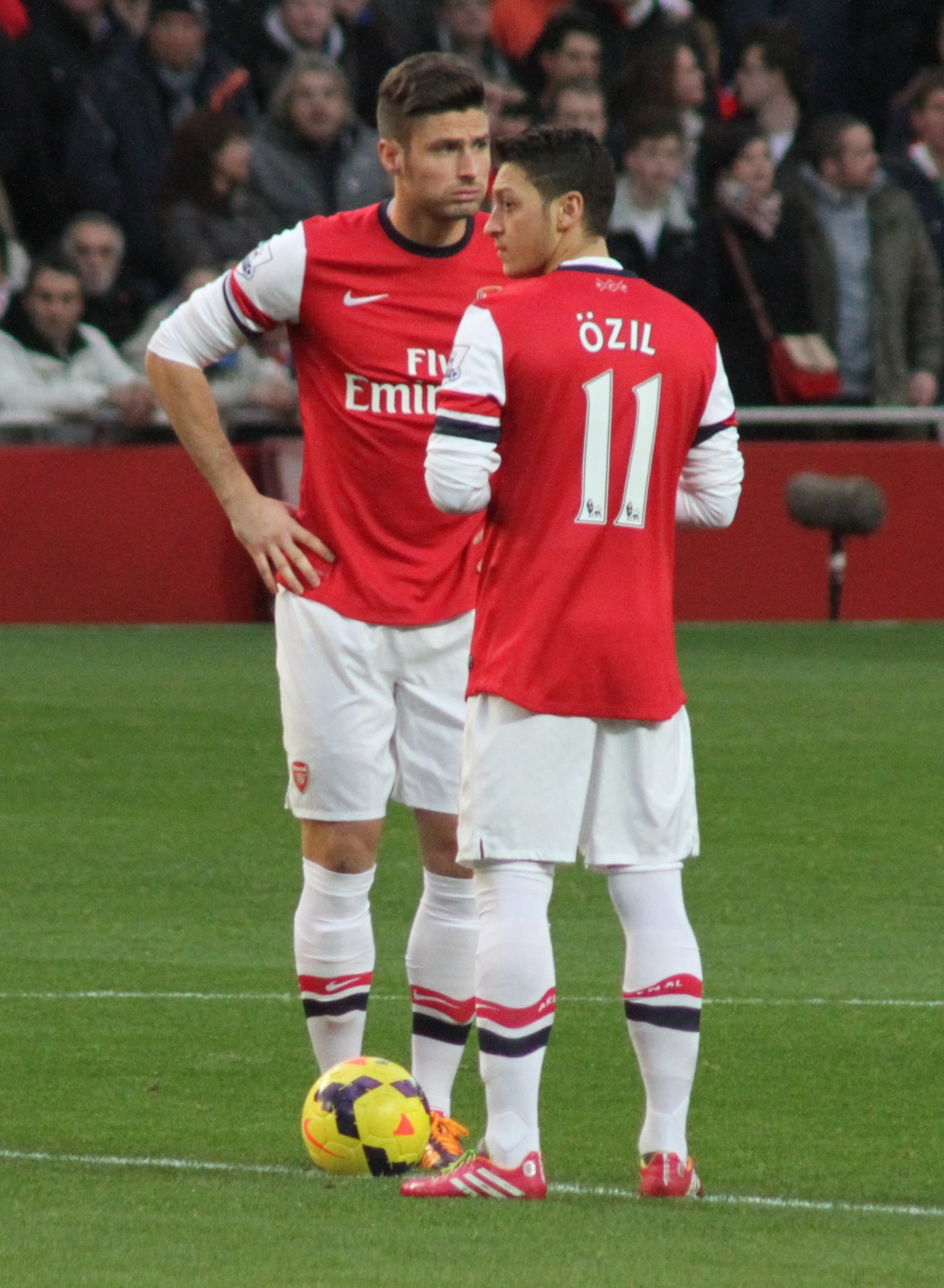 외질은 2013년 9월 14일 선덜랜드와의 리그 원정 경기에서 아스널 첫 경기를 치렀다. 그는 11분에 올리비에 지루의 골을 도와 3-1 승리에 일조했다.[568] 사흘 후, 마르세유를 상대로 UEFA 챔피언스리그 첫 경기를 치렀다.[569] 3주 후, 스토크 시티를 상대로 안방 첫 경기에서 3골에 모두 관여했는데, 두 골은 직접 도왔고, 나머지 한 골은 프리킥이 막힌 후 에런 램지에게 연결되었다.[570] 나폴리와의 UEFA 챔피언스리그 경기에서 램지의 크로스를 마무리하며 아스널 1호골을 득점했다.[571] 10월 19일, 노리치 시티와의 안방 경기에서 프리미어리그 1, 2호골을 득점했다.[572]10월, 외질은 FIFA 발롱도르 후보에 올랐고, UEFA 올해의 팀에도 이름을 올렸다. 12월에는 헐 시티와 에버턴과의 경기에서 두 골을 추가했다. 경미한 어깨 부상으로 뉴캐슬 유나이티드와의 12월 마지막 경기에 결장했다.