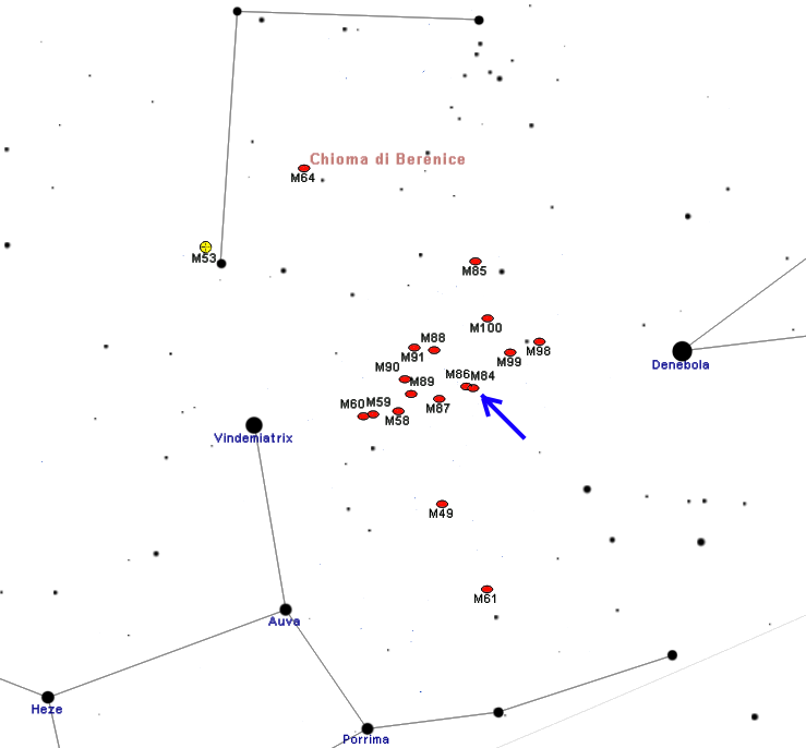 M84는 1781년 샤를 메시에가 발견한 렌즈상 은하 또는 타원 은하이다. 메시에 목록에 등재되었으며, 세 개의 초신성이 관측되었다. M84는 주변에 많은 은하들이 밀집되어 있는 마르카리안의 사슬에 속해 있으며, 중심부에 블랙홀이 존재한다.
