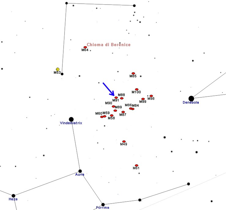 메시에 91은 1781년 샤를 메시에가 발견한 막대나선은하로, 처녀자리 은하단에 속해 있으며 약 5200만 ~ 5800만 광년 거리에 있다. 메시에가 위치를 잘못 기록하여 한동안 잃어버린 천체로 여겨졌으나, 1969년 윌리엄 C. 윌리엄스에 의해 재확인되었다. 우리 은하를 향해 접근하는 특이한 속도와 빈혈 은하라는 특징을 갖는다.