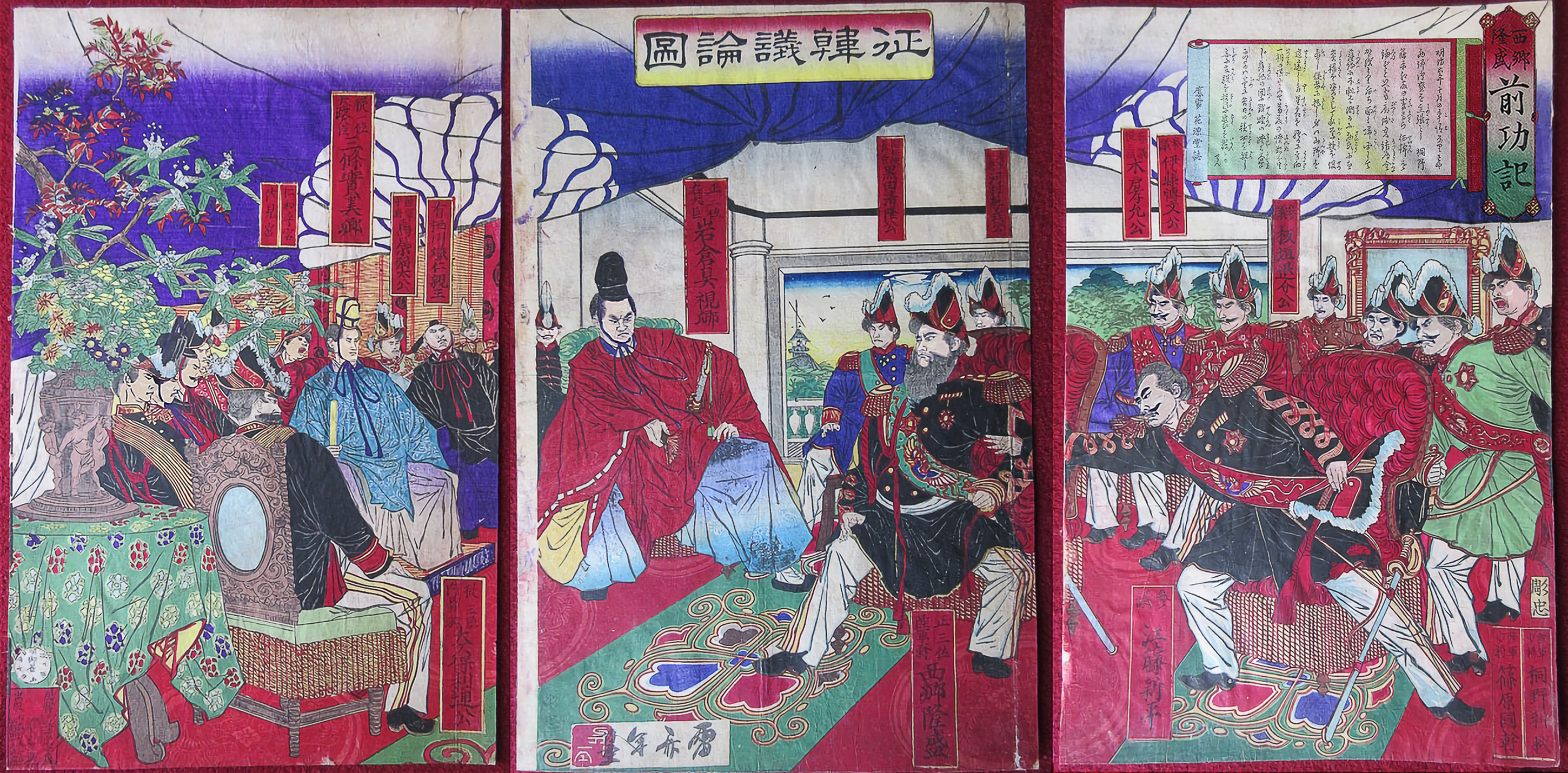 사이고 다카모리, 이타가키 타이스케 등은 조선의 개국을 촉구하고 '정한론'을 주창했다. 그러나, 1873년(明治 6년) 유럽 시찰에서 귀국한 이와쿠라 도모미, 오쿠보 도시미치 등은 국내 개혁의 우선을 주장하여 이에 반대했다(明治六年政変)[60] 사이고, 후쿠시마, 고토, 이타가키, 에토 등 5참의가 사퇴한 후, 강화도 사건이 발발하여 1876년(明治 9년) 조일수호조규(강화도 조약)를 맺고 조선을 개국시켰다. 또한, 청나라에 대해서는 1871년(明治 4년) 조청수호조규를 맺고 류큐번을 두고, 1874년(明治 7년) 대만에 출병했다(정대의 역). 1879년(明治 12년) 오키나와현을 설치했다. 러시아에 대해서는 1875년(明治 8년)에 사할린·쿠릴 교환 조약을 맺고, 사할린을 러시아 영토, 쿠릴 열도를 일본 영토로 정했다. 또한 오가사와라 제도, 센카쿠 제도, 독도도 일본 영토로 하고, 일본의 영역을 일단 확정했다.