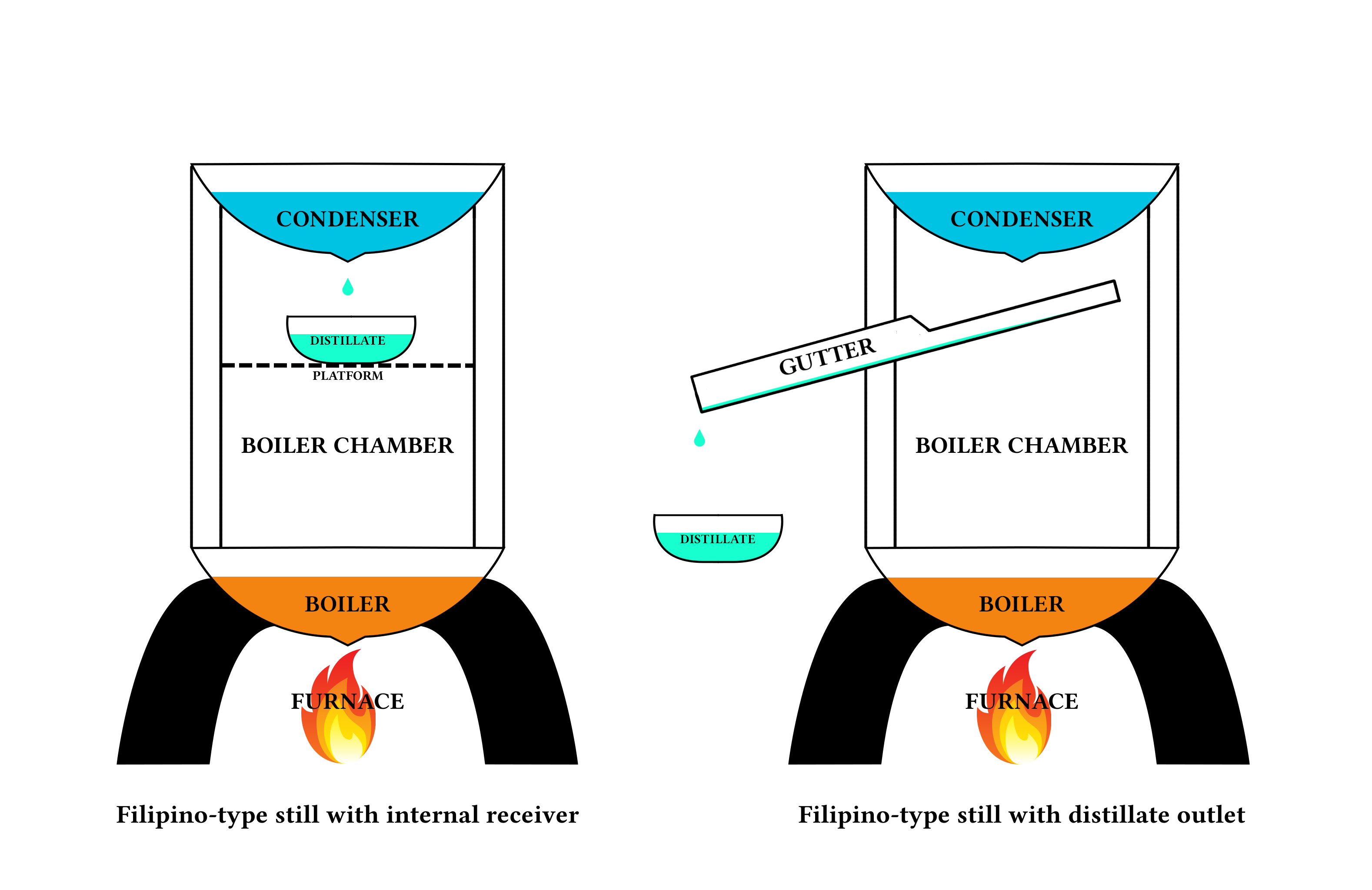 몽골과 동아시아 증류기에서 파생된 필리핀식 증류기는 유럽식 알렘빅 증류기와 매우 다르다. 알렘빅식 증류기보다 덜 효율적이지만, 저렴하고 제조가 쉬웠다. 속이 빈 통나무와 두 개의 구리 또는 철 냄비 등 다양한 재료로 만들어졌다. 윗 냄비는 차가운 물로 채워져 응축기 역할을 하고, 하단 냄비는 발효된 즙을 담아 보일러 역할을 한다. 증류액은 두 냄비 사이의 수집기 및 홈통을 통해 외부 용기로 빠져나온다.[5] 타라스칸 증류기, 사포테코 증류기 등 다양한 변형이 존재한다.[7][8][9][3] 할리스코와 미초아칸의 메즈칼 및 데킬라 제조업체에서는 필리핀식 증류기를 여전히 "필리핀 증류기"(destilador Filipinoes)라고 부른다.[10]