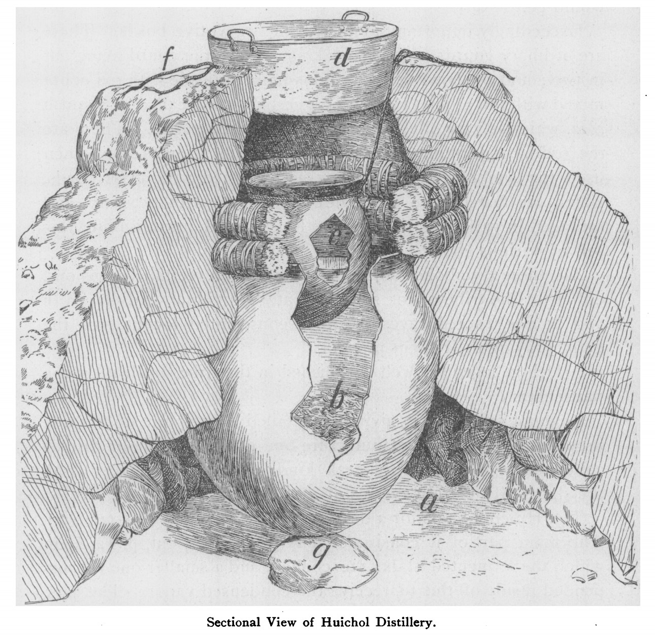4. 증류: 발효된 매시는 점토 또는 구리 냄비로 증류하여 메즈칼을 만든다. 이 과정에서 최종 제품의 풍미가 더욱 수정된다.[35] 메즈칼은 테킬라처럼 두 번 증류한다. 첫 번째 증류는 "오르디나리오"라고 불리며 약 75 프루프(알코올 농도 37.5%)가 나온다. 이후 액체를 두 번째로 증류하여 알코올 비율을 높인다.