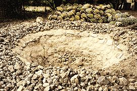 2. 피냐 굽기: 피냐를 약 3일 동안 구덩이 오븐에서 굽는다. 이 오븐은 뜨거운 돌이 담긴 구덩이 위에 흙으로 만든 언덕 형태이며, 이 지하 굽기를 통해 메즈칼 특유의 강렬한 스모키한 풍미가 생긴다.[45][35]