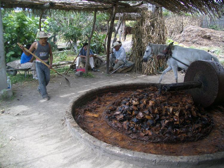 3. 으깨기 및 발효: 구워진 피냐는 으깨어진 후 물과 함께 대형 통이나 배럴에서 발효된다.[4] 전통적으로는 말에 의해 회전되는 돌 바퀴를 사용하여 으깨는 과정을 거친다.