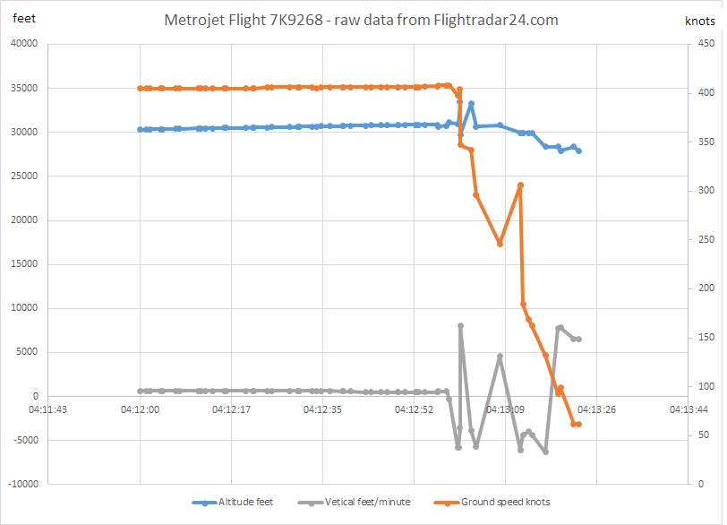 이집트 민간 항공부는 비행기가 1분 만에 약 1524.00m 급강하 후 레이더에서 사라졌을 때 약 9448.80m 고도에 있었다고 발표했다. Flightradar24는 항공기가 네켈에서 북동쪽으로 약 50km 떨어진 지점에서 404knot 속도로 약 10210.80m까지 상승한 후 갑자기 62knot 속도로 약 8648.70m까지 하강했고, 그 이후에는 위치가 더 이상 추적되지 않았음을 보여준다.[34] 항공기에서 폭탄이 폭발하여 제어 불가능한 감압이 발생했고, 항공기는 공중에서 분해되었다.[35] 승객과 승무원 224명 전원이 사망했다.[33]