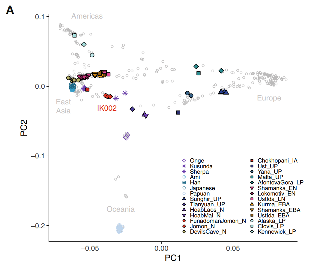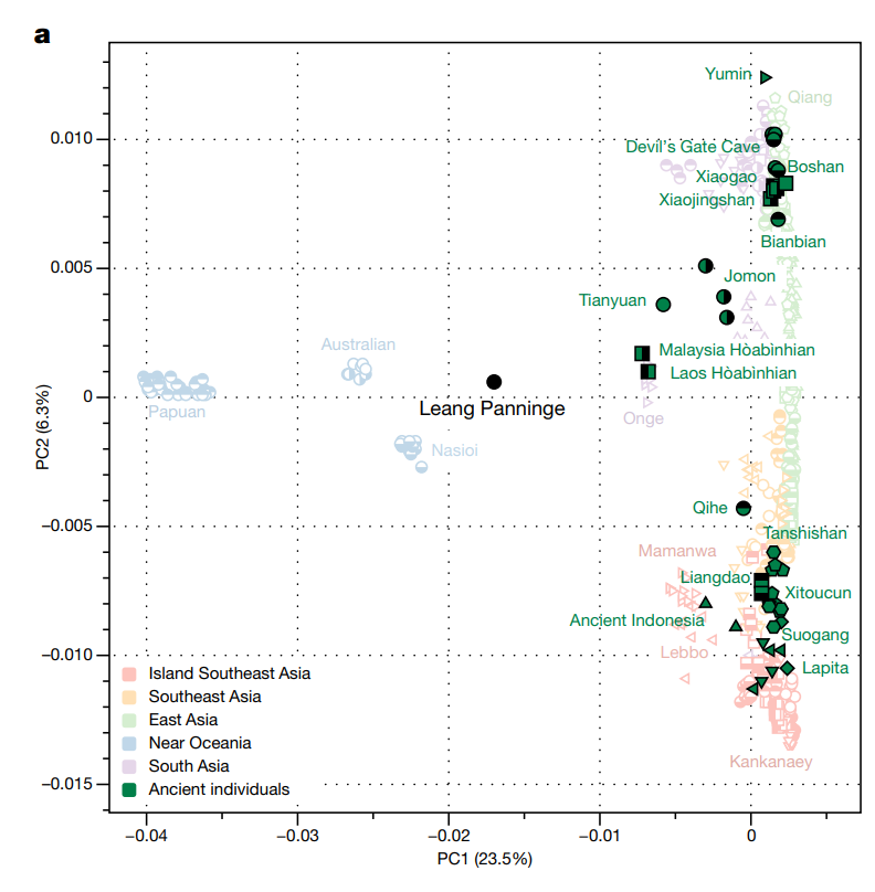 동아시아와 근대 오세아니아 출신의 현재 개인에 대해 계산된 PCA. PC1(23.8%)은 동아시아인과 오스트랄로-멜라네시아인을 구별하는 반면, PC2(6.3%)는 북남 경사면을 따라 동아시아인을 구별한다.