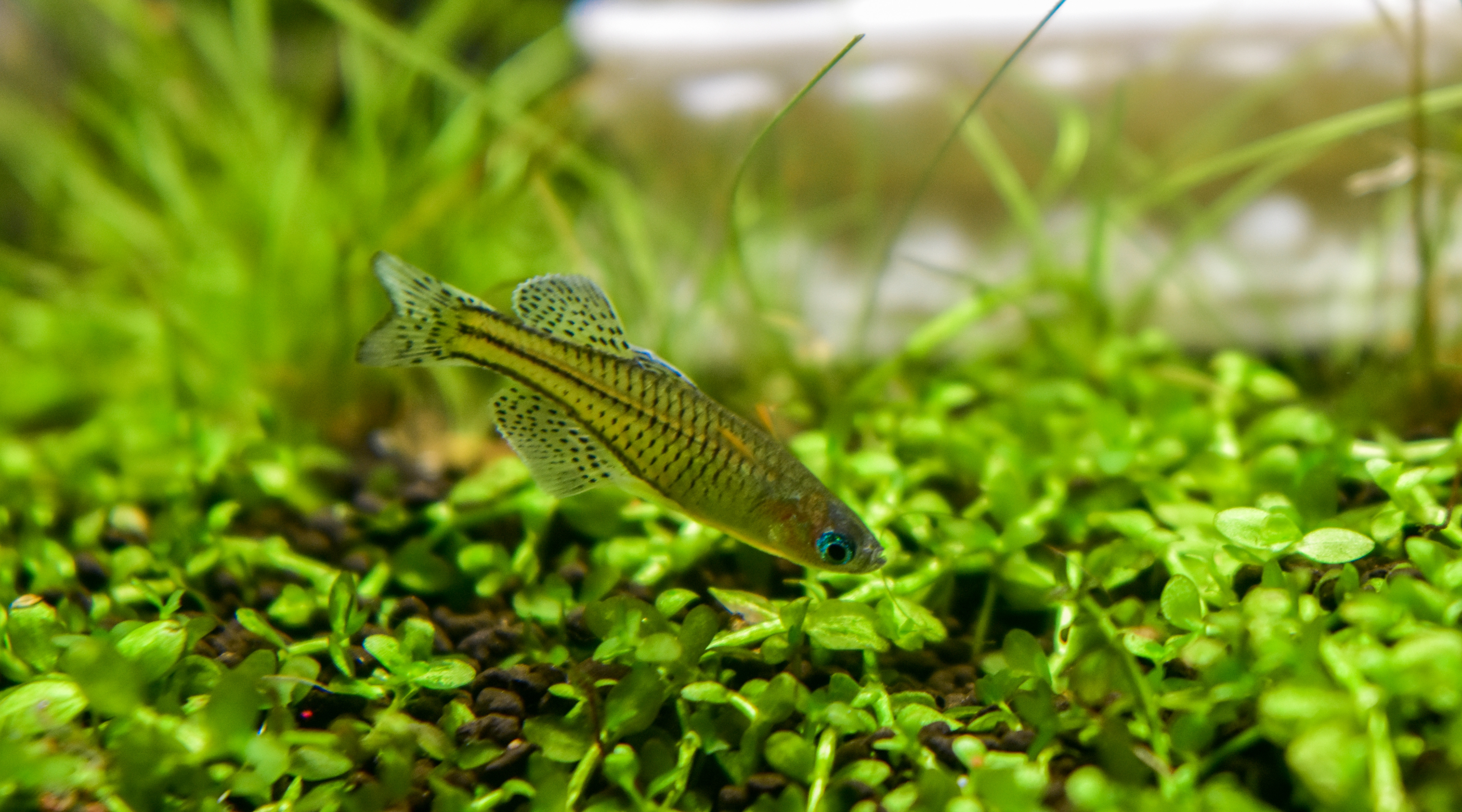 : 영명은 Neon blue-eye 또는 Blueback blue-eye이다. 전체 길이는 3cm 정도. 수컷은 각 지느러미가 노란색과 검은색으로 물들고, 몸 측면에 푸른 광택이 보인다. 오스트레일리아 북부의 기수역에 있는 맹그로브대에 서식하는 종. 우기에는 염분 농도가 현저하게 낮아지는 수역이기 때문에 순수한 담수에도 어느 정도 견딜 수 있지만, 기수를 재현한 약알칼리성 염수가 더 상태 좋게 사육할 수 있다. 상쾌한 체색으로 인기가 있는 반면, 환상의 레인보우 피쉬라고 칭해질 정도로 유통은 드물다.