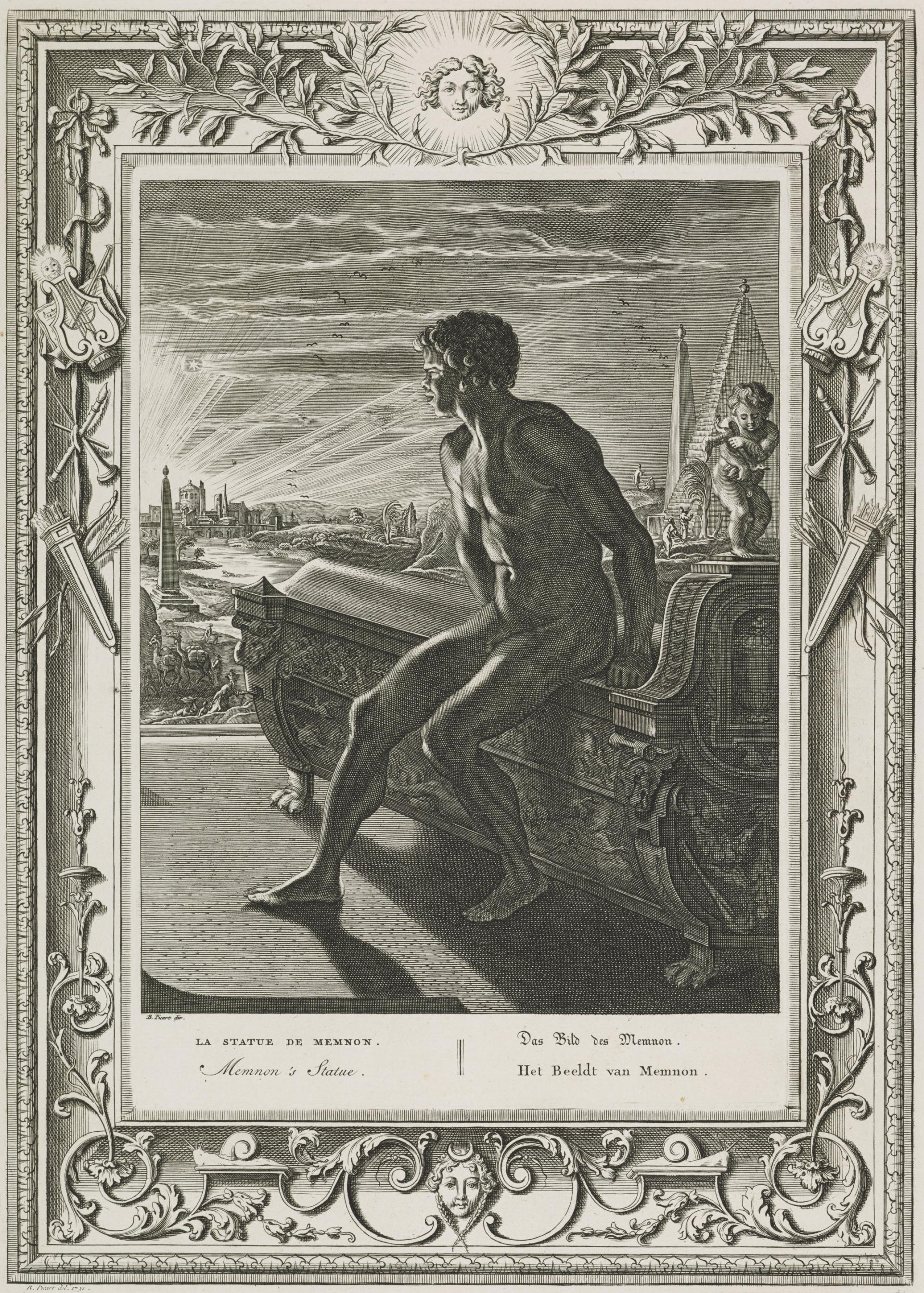 멤논 거상은 이집트 룩소르에 있는 3,400년 된 거대한 쌍둥이 석상으로, 파라오 아멘호테프 3세를 조각한 것이다. 그리스와 로마 방문객들은 적어도 1세기부터 이 석상들을 신화 속 멤논과 연관시켰고, 파라오의 초상 조각상을 "멤논"이라고 불렀다. R. 드루 그리피스는 이러한 동일시가 동상이 동지날 일출을 향하고 있어 새벽과 연결되었기 때문이라고 주장했다.[28]