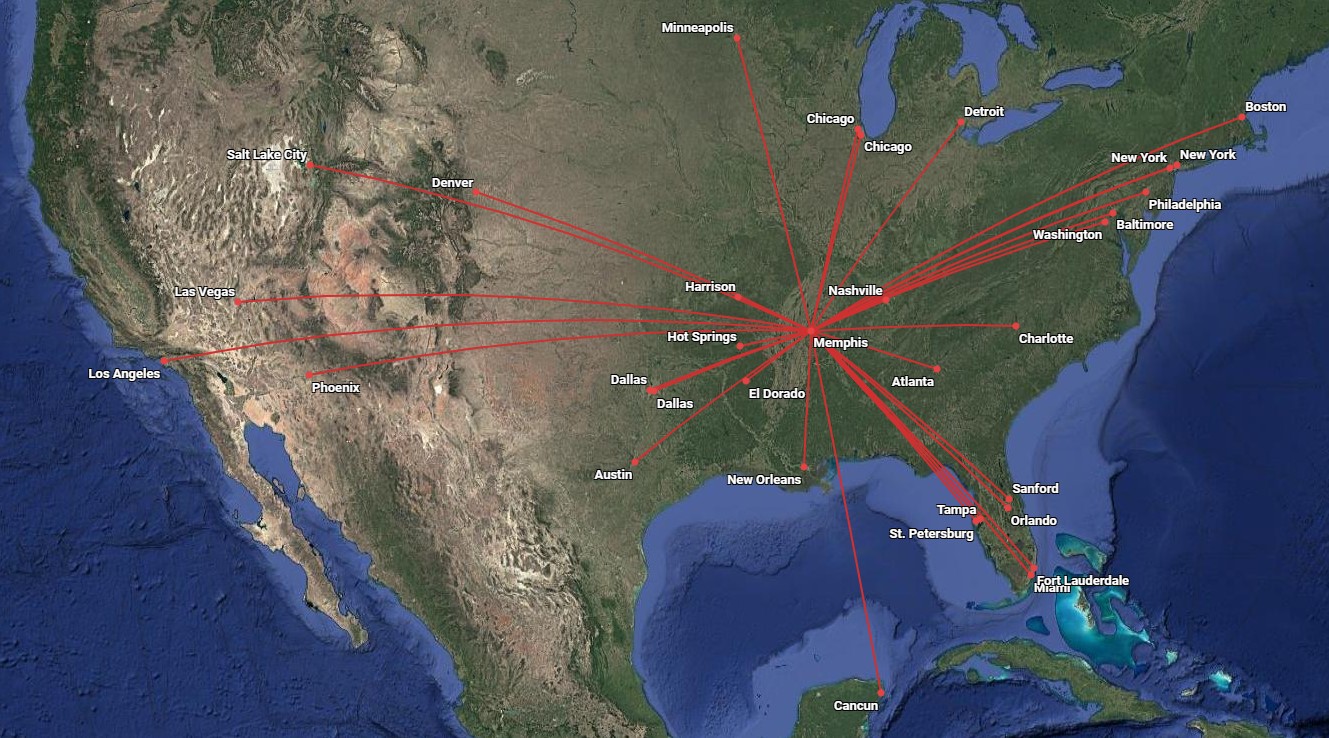 페덱스의 멤피스발 직항편은 미국 본토 내 도시와 앵커리지(Anchorage), 호놀룰루(Honolulu), 캐나다(Canada), 카리브해(Caribbean), 멕시코(Mexico)의 많은 도시를 포함한다. 대륙 간에는 파리(Paris)의 샤를 드 골 공항(Charles de Gaulle Airport), 런던(London)의 런던 히드로 공항, 프랑크푸르트(Frankfurt)의 프랑크푸르트 공항(Frankfurt Airport), 두바이(Dubai)의 두바이 국제공항(Dubai International Airport), 상파울루(São Paulo)의 상파울루 시(São Paulo), 도쿄(Tokyo)의 나리타 국제공항(Narita International Airport), 서울(Seoul)의 인천 국제공항(Incheon International Airport)과 연결되어 있다.