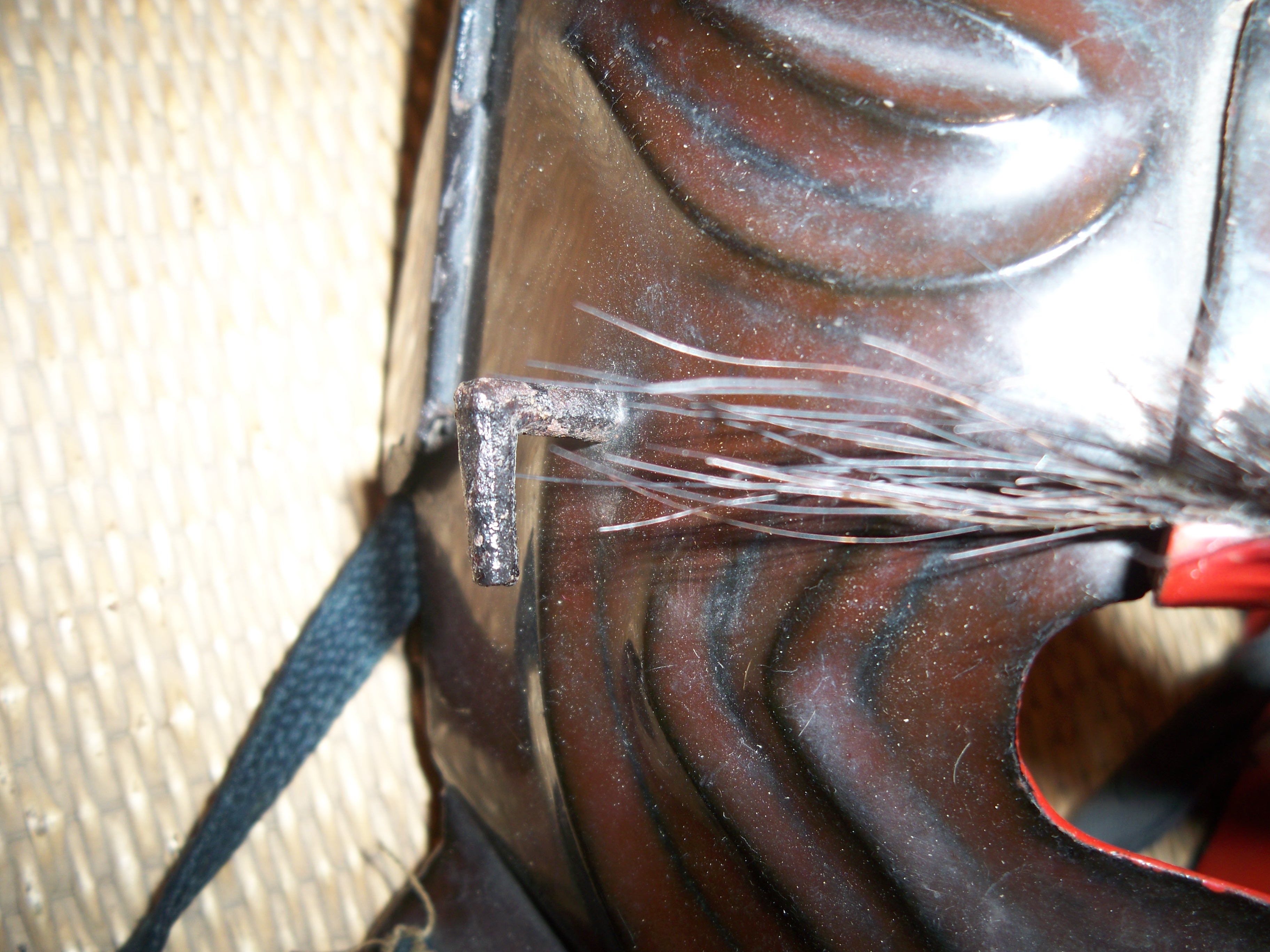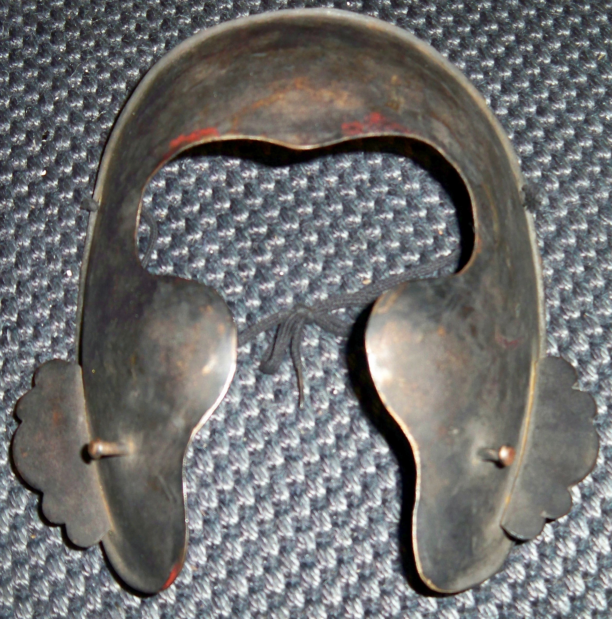''오도메''(odome)는 면구(men-yoroi)에 부착된 기둥 형태의 돌기로, 가부토(투구)의 턱 끈인 ''시노비노오(Shinobi-no-o)''를 고정하는 데 도움을 주었다.[4]4. 2. 오리쿠기 (ori-kugi)
