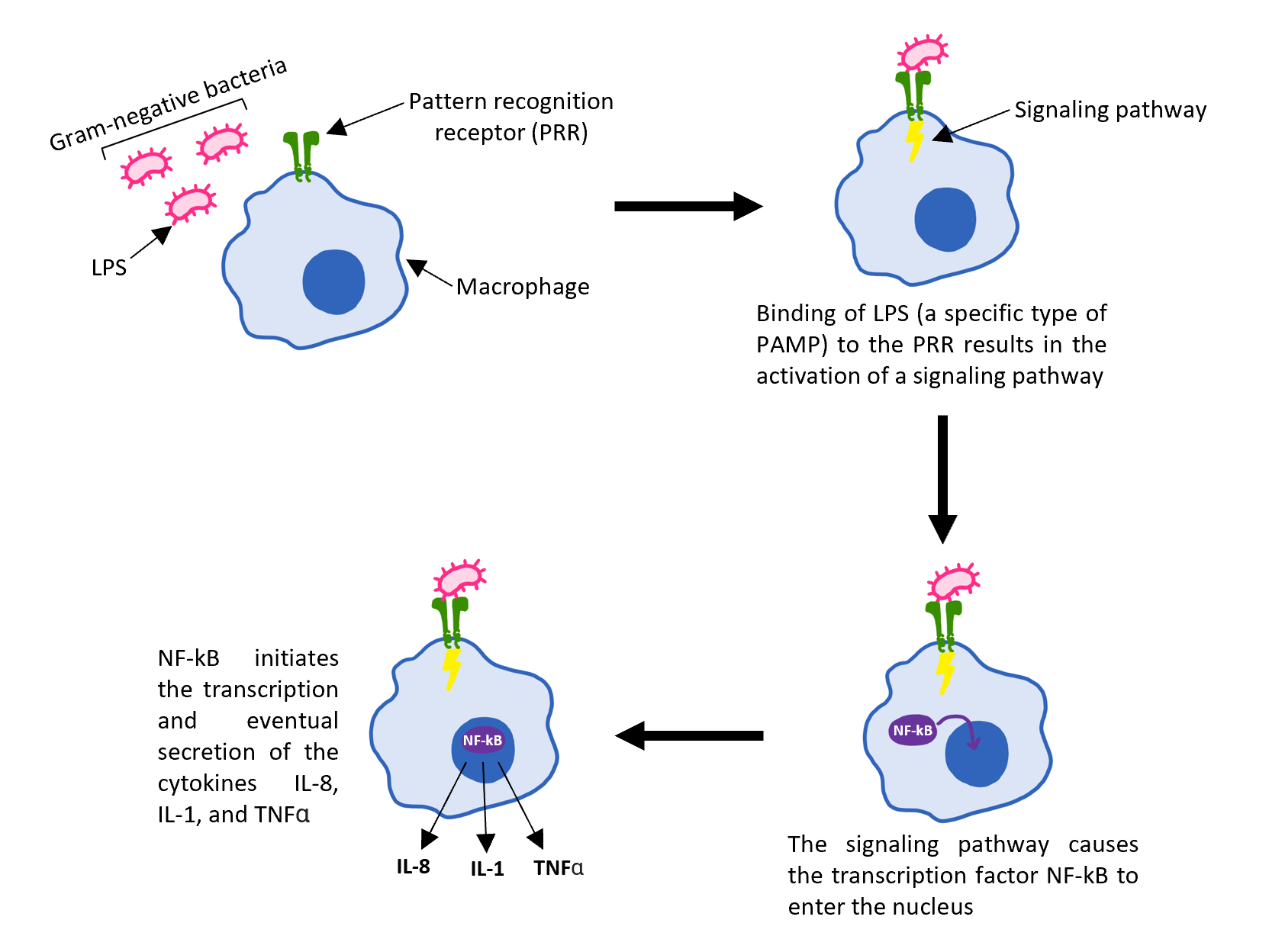 병원체는 패턴인식수용체(PRR)를 통해 인식되고 감지된다. 이러한 수용체는 대식세포 등의 표면에 존재하는 구조로, 외부 침입자에 결합하여 면역 세포 내에서 세포 신호 전달을 시작할 수 있다. PRR은 병원체의 필수 구조적 구성 요소인 병원체연관분자패턴(PAMP)을 식별한다. PAMP의 예로는 세균 세포벽의 펩티도글리칸이나 지질다당류(LPS)가 있으며, 이들은 모두 세균에 필수적인 요소이므로 여러 세균 종에 진화적으로 보존되어 있다.[27]2. 3. 선천면역 반응 활성화
