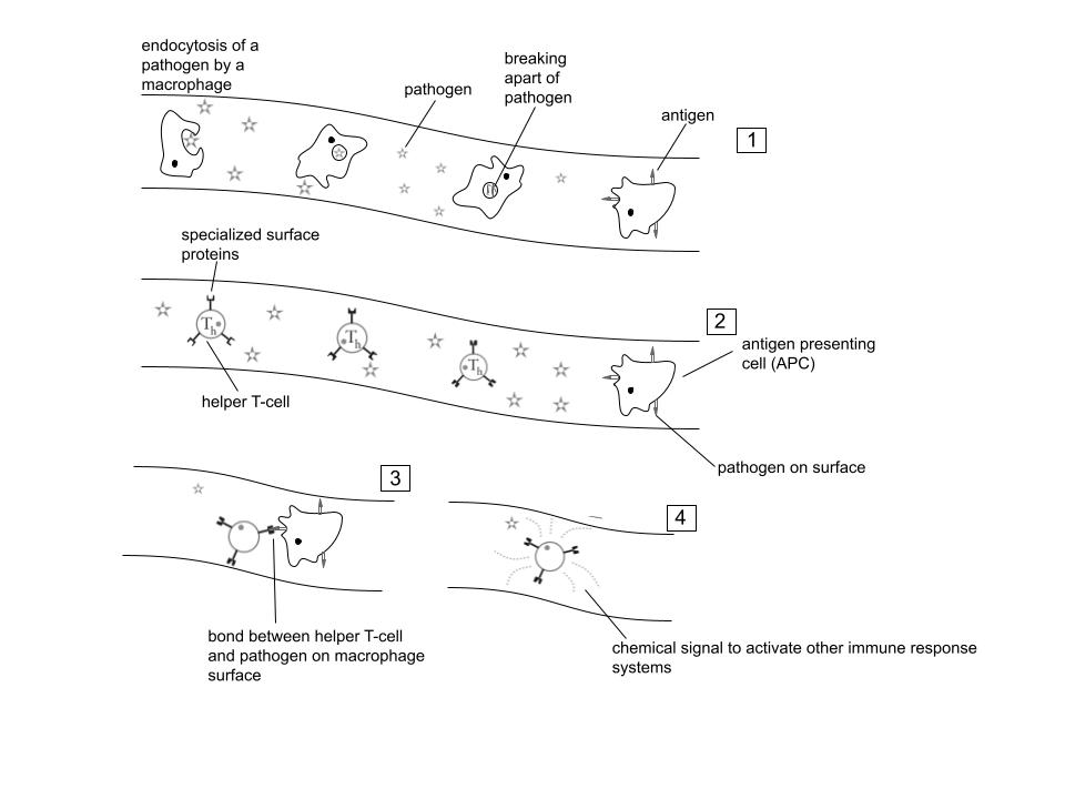 항원제시세포(APC)는 세포 표면에 MHC 클래스 II 분자를 통해 외부 항원을 제시하여 미성숙 보조 T세포를 활성화한다. 항원제시세포에는 수지상세포, B세포, 대식세포가 있으며, 이들은 MHC 분자뿐만 아니라 보조 자극 리간드도 발현한다. 보조 자극 리간드는 보조 T세포의 보조 자극 수용체에 의해 인식된다. 보조 자극 분자가 없으면 적응면역 반응이 불충분하게 일어나며 T세포는 무반응 상태에 빠진다.[30] 특정 APC에 의해 여러 T세포 아집단이 활성화될 수 있으며, 각각의 T세포는 특정 미생물 항원을 처리하기 위해 준비되어 있다. 활성화되는 T세포와 면역 반응의 종류는 APC가 항원을 처음 마주친 상황에 부분적으로 의존한다.[30]
