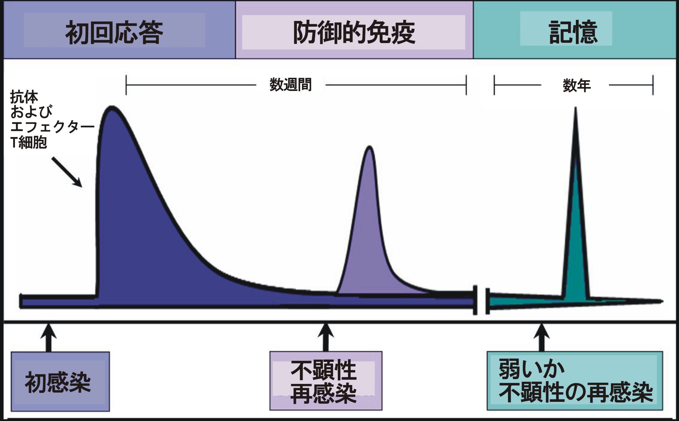 수두, 홍역 등 일부 질병에 대한 면역은 평생 지속되지만,[32][33][34] 많은 질병에 대한 면역은 시간이 지나면서 사라진다. 뎅기열과 같은 일부 질병에 대한 면역 반응은 역설적으로 다음 감염을 악화시킨다(항체의존성 감염증강).[35]