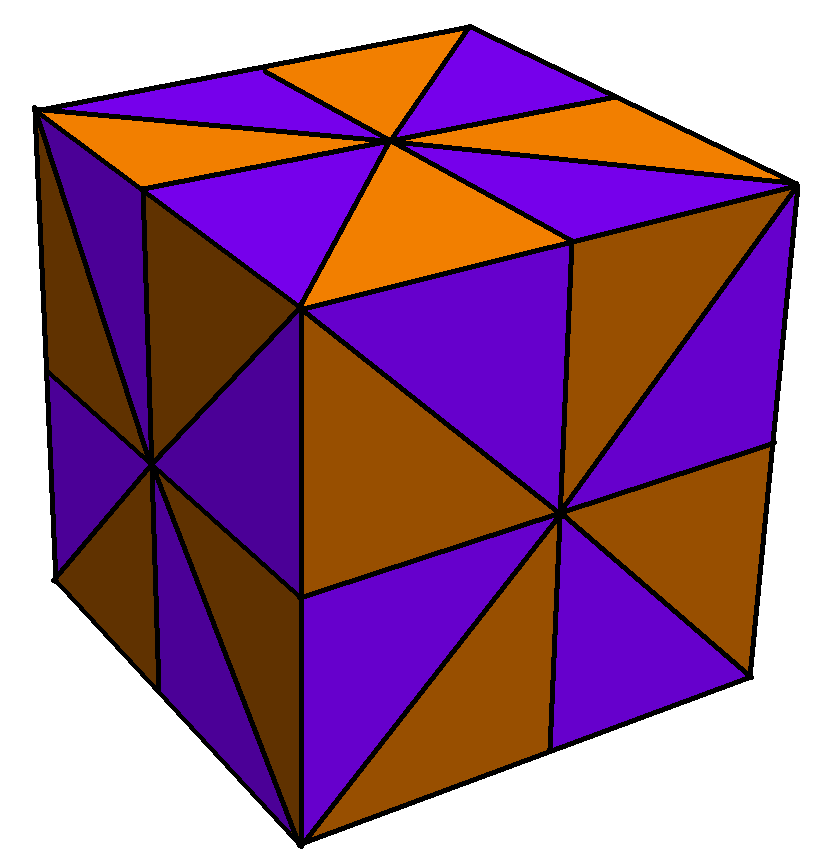 마름모 입방 팔면체는 1가지 유형의 삼각형과 2가지 유형의 사각형을 갖는다.의사 마름모 입방 팔면체는 1가지 유형의 삼각형과 3가지 유형의 사각형을 갖는다.델타 24면체는 1가지 유형의 면을 갖는다.의사 델타 24면체는 동일한 모양의 2가지 유형의 면을 갖는다.