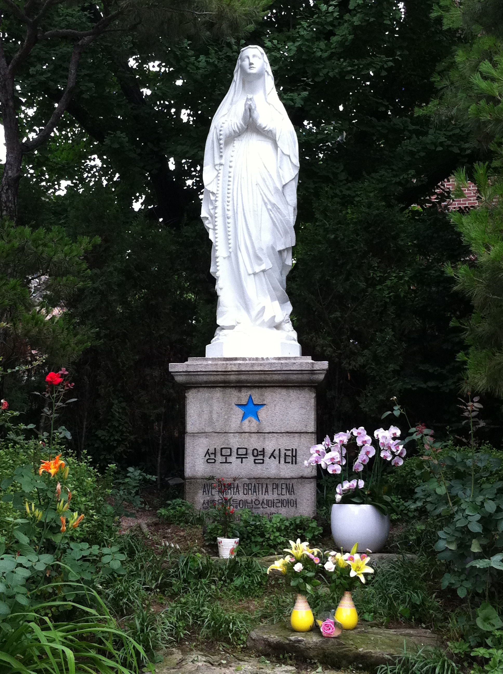 성당 외부에는 1948년 교회 봉헌 50주년을 기념하여 프랑스에서 제작된 루르드의 성모상이 세워졌다. 1960년 8월 27일에는 로기남 바오로 대주교가 성모 동굴을 봉헌하며 한국 통일을 위해 기도했다.[17]