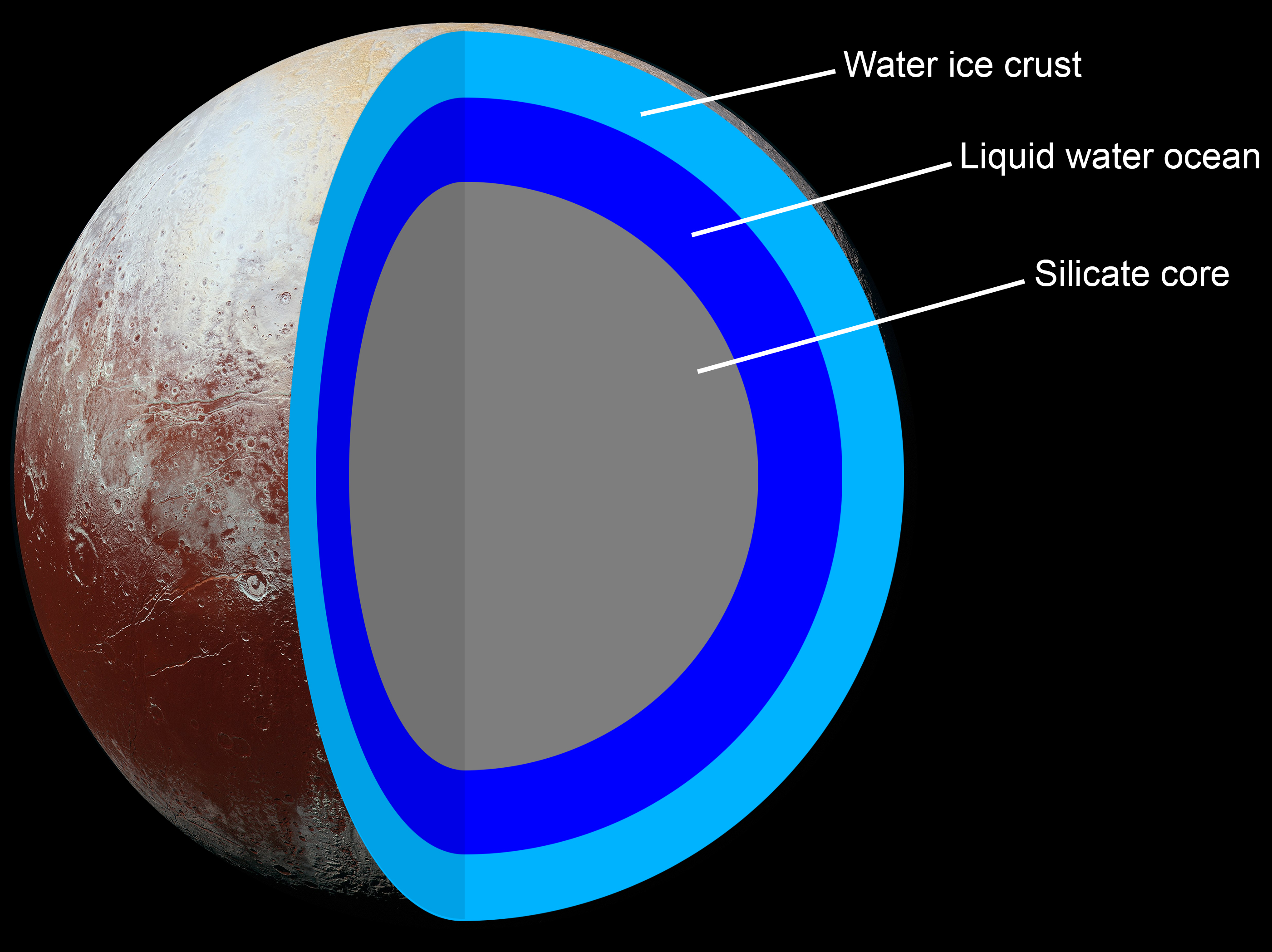 허블 망원경 관측에 따르면 명왕성의 밀도는 1.8~2.1 g/cm3 정도이며, 내부 조성은 질량의 대략 50~70%는 바위층, 30~50%는 얼음층으로 구성되었을 것으로 추정된다.[303] 방사성 붕괴를 일으키는 원소들이 얼음을 충분히 가열하여 바위층과 얼음층은 분리되어 있을 것으로 예상되며, 바위층은 밀도가 높은 핵을 형성하고 얼음층은 맨틀을 형성하고 있을 것이다. 핵의 지름은 대략 1700 km 정도로, 명왕성 지름의 70%에 해당할 것으로 추정된다.[303]내부 가열이 지속된다면 핵과 맨틀 사이에 100km~180km 두께의 액체 물층이 존재할 수도 있다.[303][304] 독일 우주항공 센터의 행성 연구 기관 계산에 따르면 명왕성의 밀도-반지름 비율은 (천왕성이나 토성의 위성 같은) 얼음 위성과 (목성의 이오 같은) 바위 위성의 중간쯤에 위치하며, 트리톤과도 유사하다.[305]