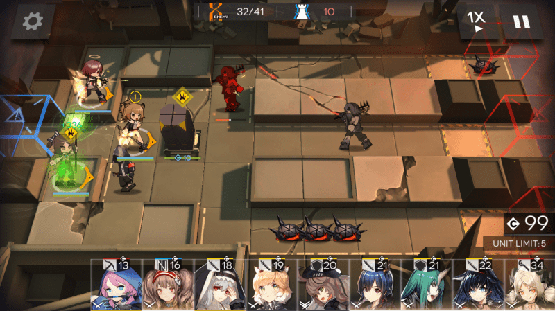 대부분의 스테이지는 근접 오퍼레이터를 배치하는 지상 타일과 원거리 오퍼레이터를 배치하는 높은 타일로 구성된다.[4] 플레이어는 적의 이동 경로와 특성을 고려하여 오퍼레이터를 적절한 위치에 배치하고 스킬을 사용하여 적을 막아야 한다. 특히 높은 난이도의 스테이지는 퍼즐 게임 요소를 포함하여 전략적인 사고를 요구한다.[5]구분 | 설명 |