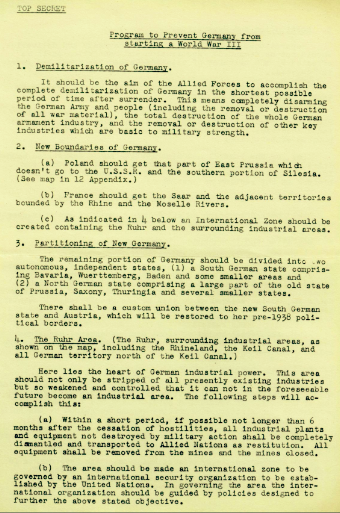| 핵심 조치 | 독일의 산업 시설 파괴 또는 이전 라인란트, 국제 관리 지역으로 분할 독일을 농업 국가로 전환 |
