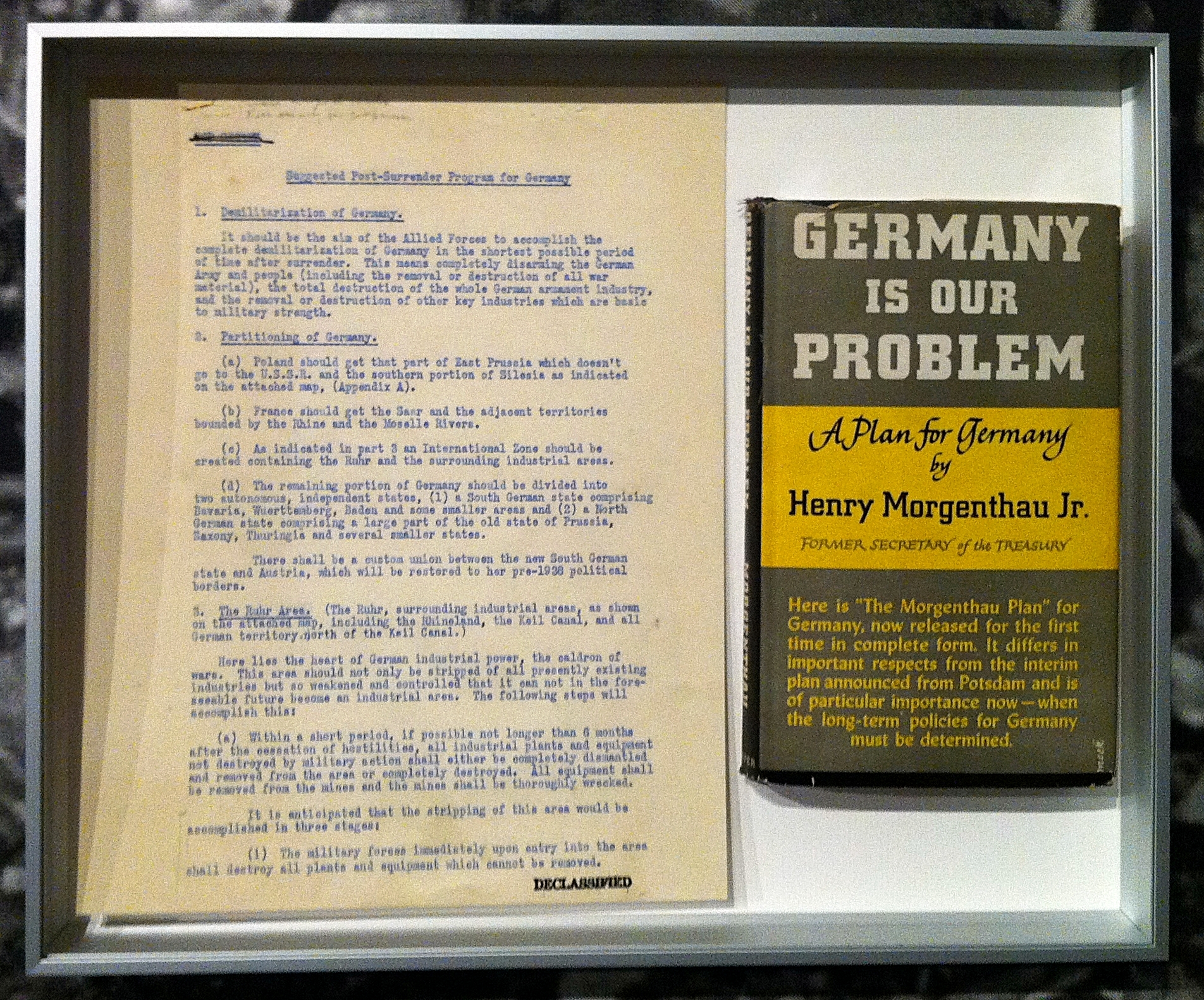 1944년 8월에 준비된 ''독일 군정 핸드북''은 독일 국민의 정상적인 삶의 빠른 회복과 독일 재건을 주장했다. 그러나 모겐소는 이 핸드북을 프랭클린 D. 루스벨트 대통령에게 알렸고, 루스벨트는 이를 읽고 "독일 국민 전체가 일어난 일에 책임이 없고, 소수의 나치만이 책임이 있다는 견해를 가진 사람들이 너무 많다. ... 독일 국민 전체가 현대 문명의 품위에 반하는 불법적인 음모에 가담했다는 것을 그들에게 확실히 알려야 한다"는 말로 거부했다.