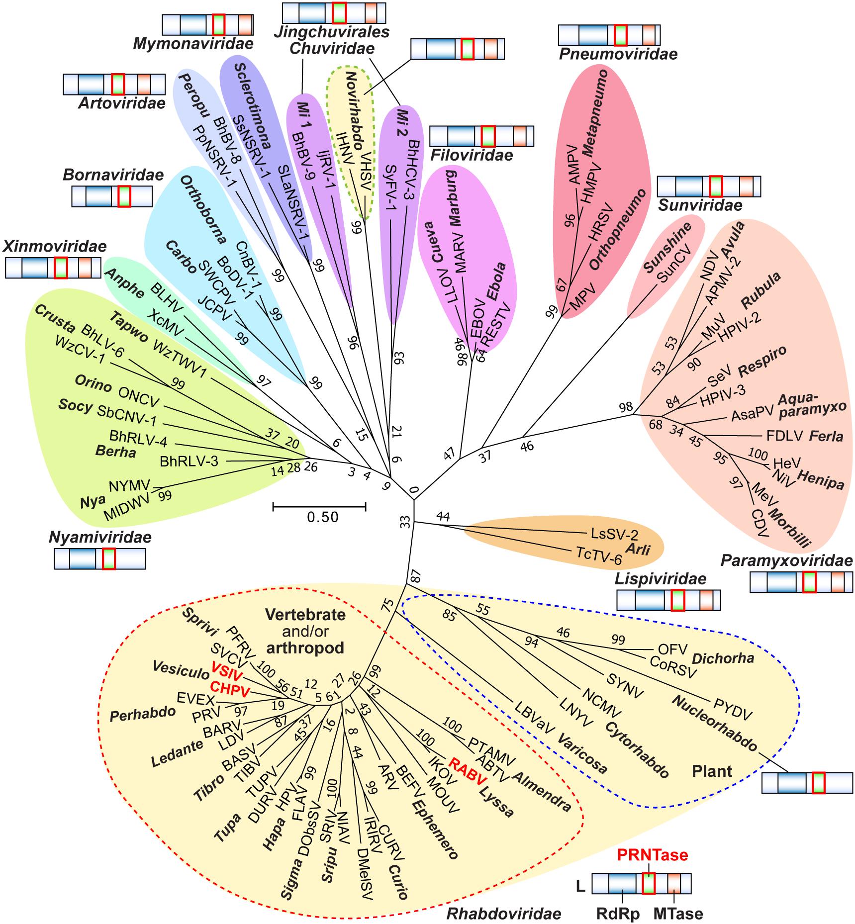 과 | 보르나바이러스과 (Bornaviridae) 필로바이러스과 (Filoviridae) 뉴모바이러스과 (Pneumoviridae) 파라믹소바이러스과 (Paramyxoviridae) 라브도바이러스과 (Rhabdoviridae) |