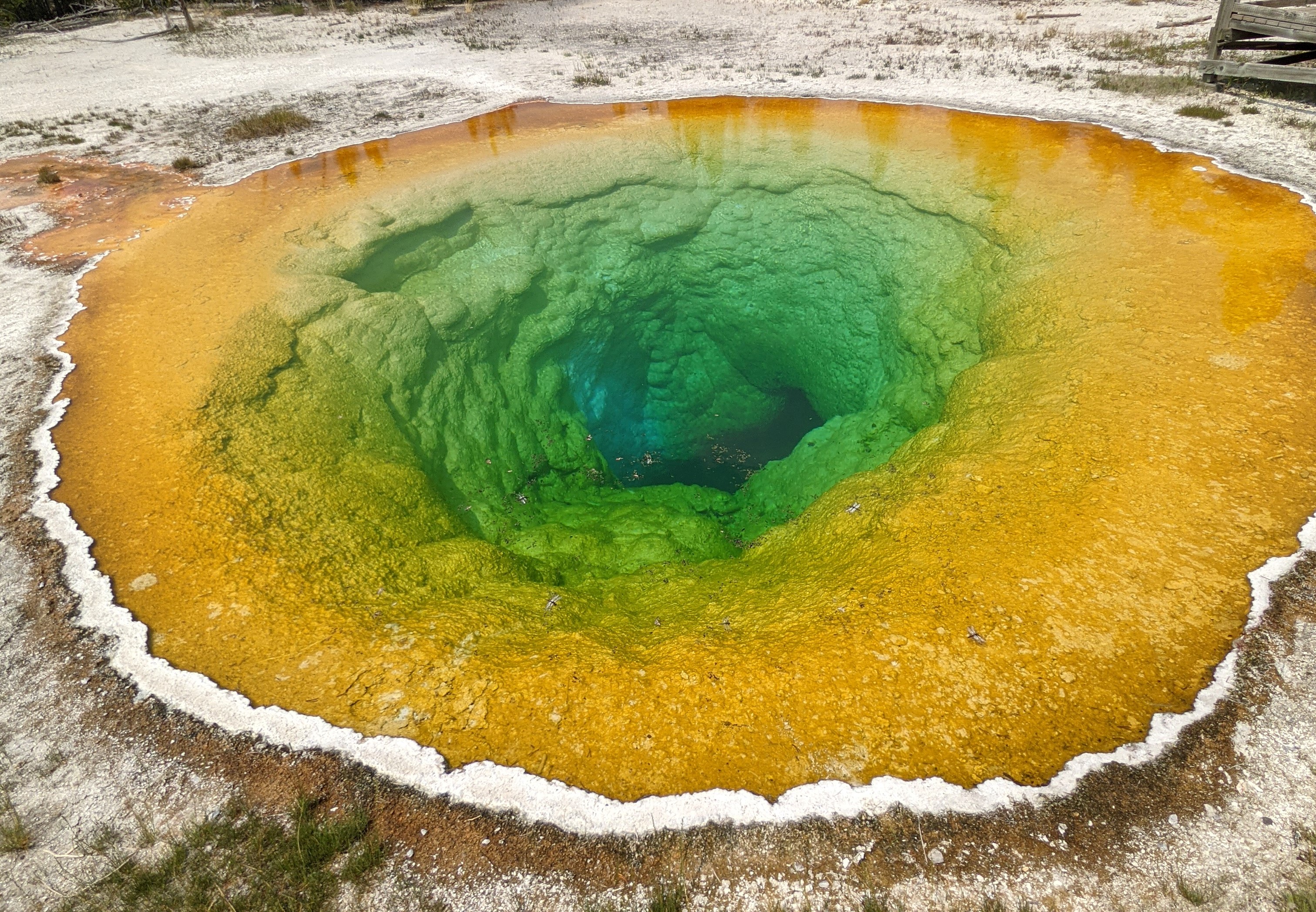 그랜드 프리즈매틱 스프링은 옐로스톤 국립공원에 있는 거대한 온천으로, 뜨거운 물을 뿜어내고 미생물 매트와 물의 특성으로 다채로운 색을 띠며 독특한 생태계를 이룬다.