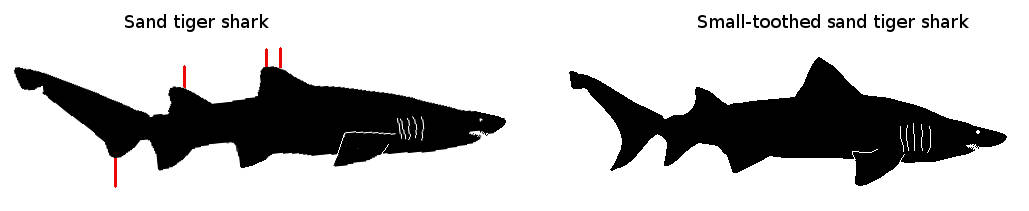 # 모래뱀상어의 첫 번째 등지느러미는 상대적으로 비대칭적이다.