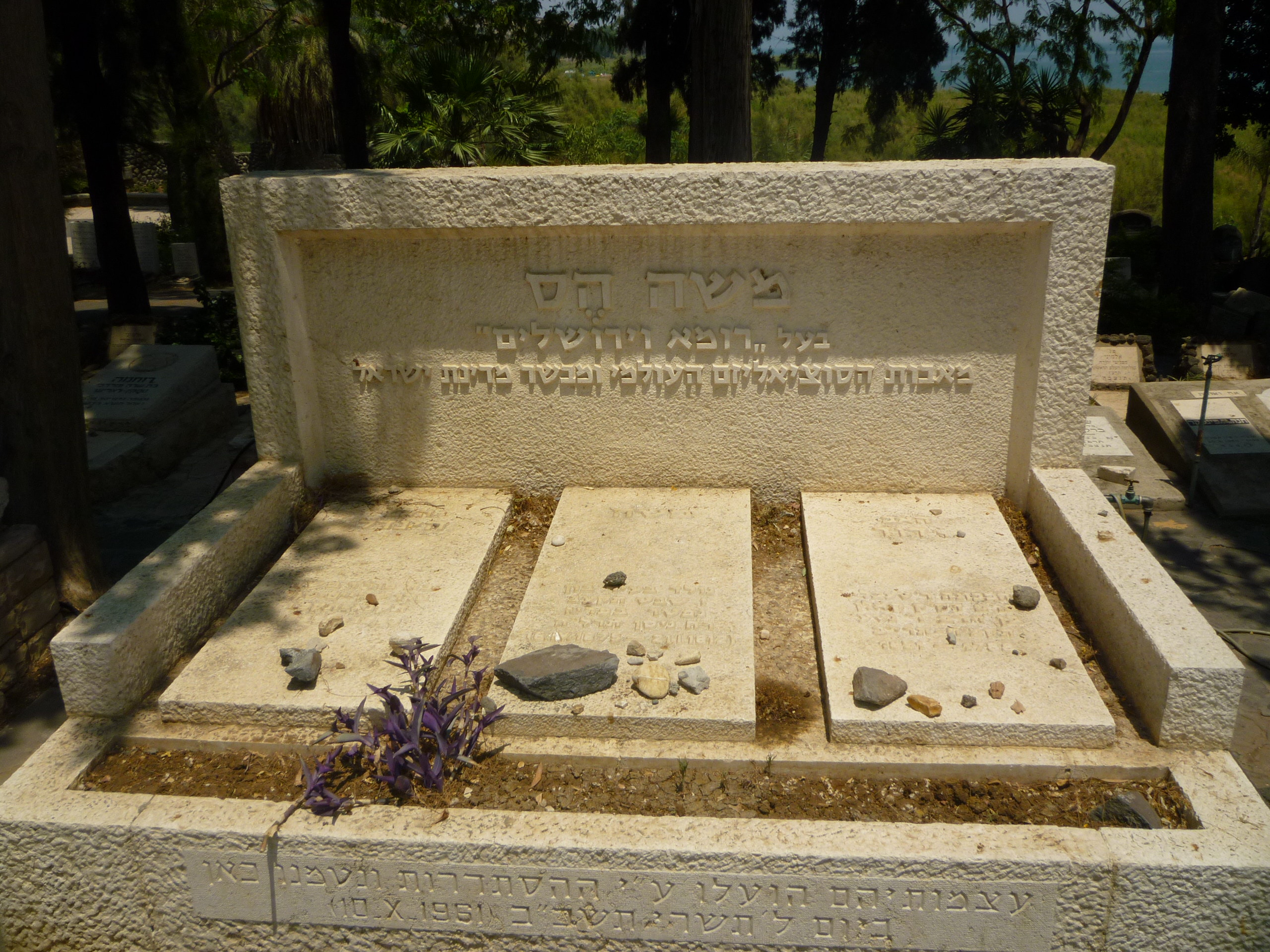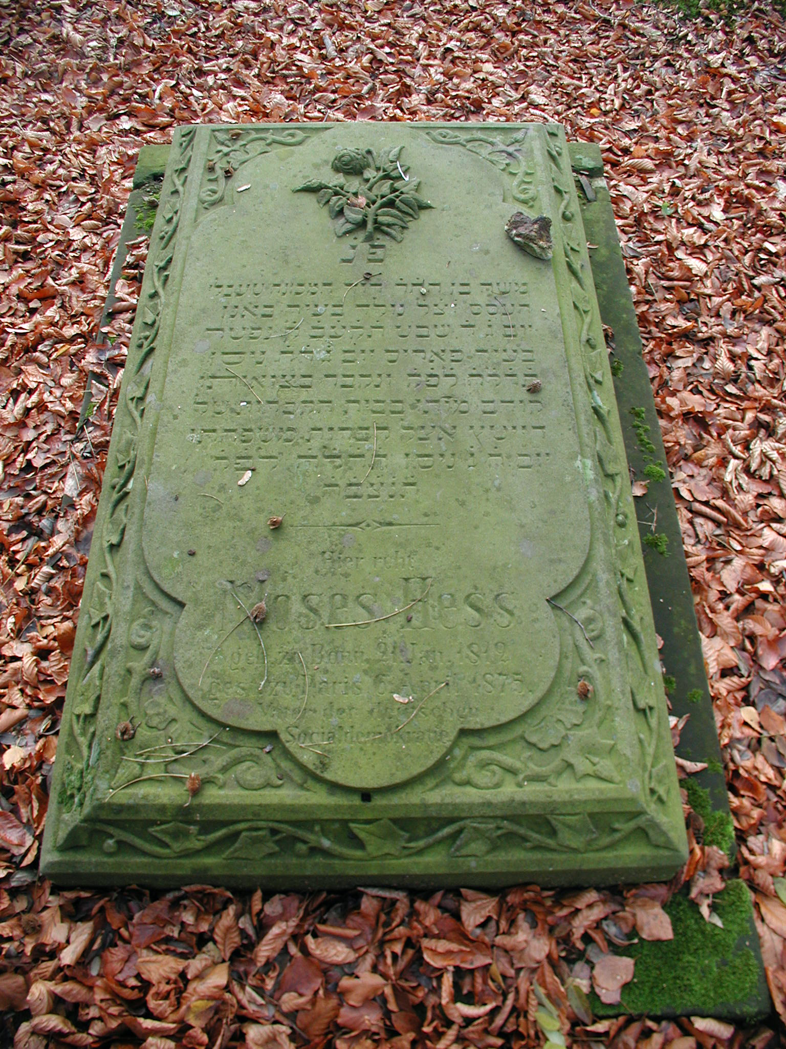 모세 헤스는 프랑스령 본에서 태어난 초기 사회주의자이자 시온주의 선구자였다. 그는 카를 마르크스와 프리드리히 엥겔스의 친구이자 협력자였으며, 엥겔스에게 공산주의 이론을 소개하기도 했다. 마르크스와 엥겔스와 결별 후, 그는 반유대주의에 대한 대응으로 팔레스타인에 유대 사회주의 연방을 건설해야 한다고 주장하는 등 시온주의 사상을 발전시켰다. 헤스는 1875년 파리에서 사망했으며, 쾰른의 유대인 묘지에 묻혔다가 후에 이스라엘 키네레트 묘지로 이장되었다.