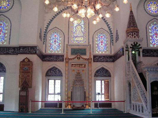 내부에는 이슬람교의 우상숭배 금지 교리에 따라 신, 천사, 예언자, 성자의 상은 없고, 주로 기하학 무늬로 장식된다. 메카 방향을 키블라(قبلة, qibla)라고 하며, 이 방향으로 벽에 미흐랍(محراب, miḥrāb)이라고 불리는 오목한 부분이 있다.