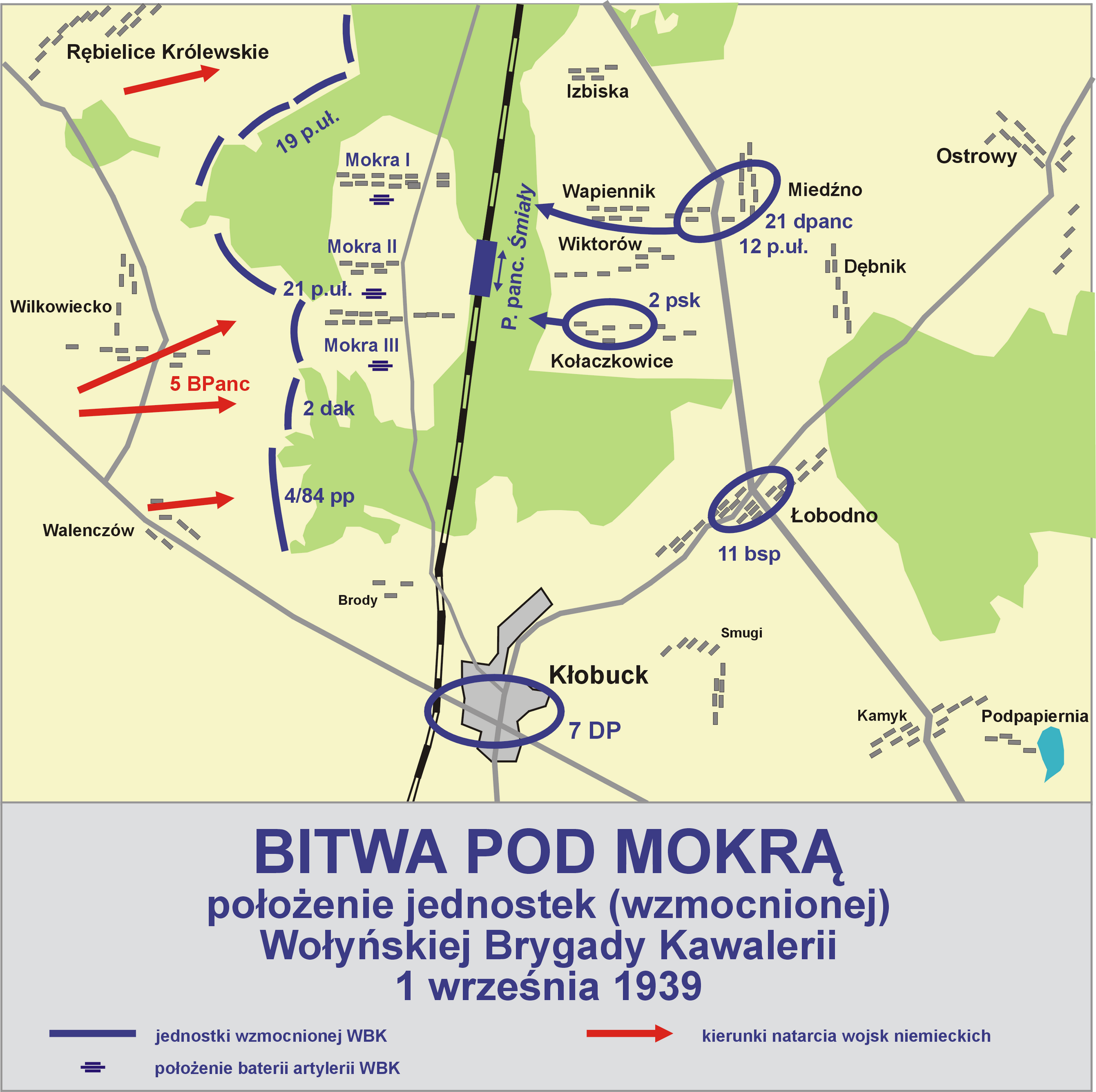 모크라 전투 폴란드 지도; 파란색 - 1939년 9월 1일 볼히니아 기병 여단의 부대 위치. 빨간색 - 독일의 공격.