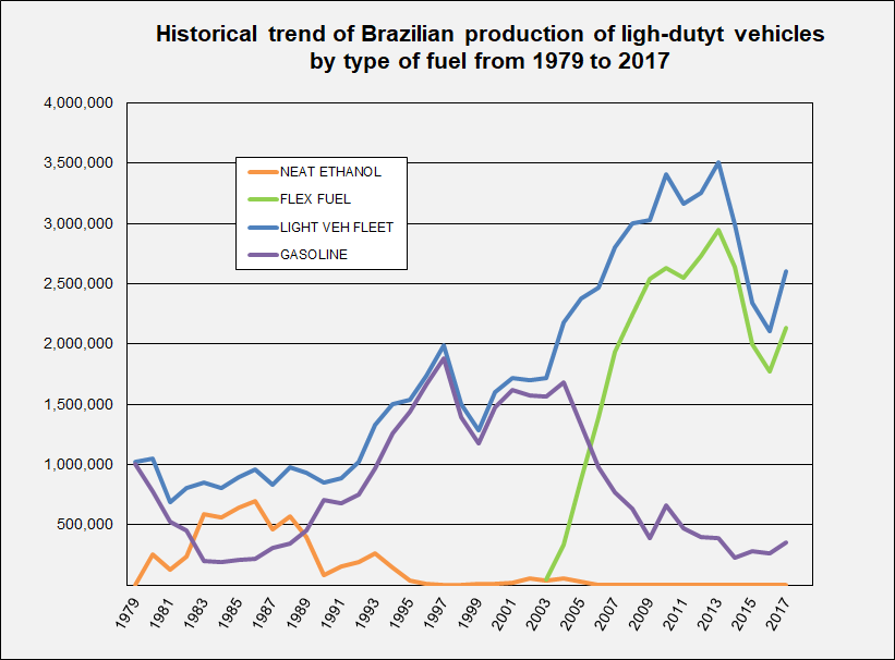 2018년 기준으로 브라질은 약 4,000만 대의 대체 연료 자동차를 보유하여 세계에서 가장 큰 규모를 자랑한다. 여기에는 3,050만 대의 가변 연료 자동차 및 경량 유틸리티 차량, 600만 대 이상의 가변 연료 오토바이가 포함된다.[58] 1979년 이후 생산된 570만 대의 에탄올 전용 경량 차량 중 240만 대에서 300만 대 사이의 순수 에탄올 차량이 여전히 사용 중이며,[59][60] 2012년 12월 기준으로 총 169만 대의 천연 가스 차량이 운행되고 있다.[62]