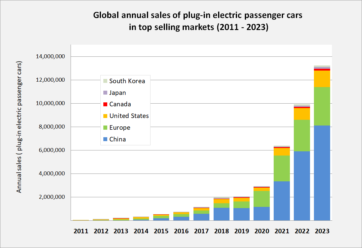 2000년대 후반부터 중국, 유럽 국가, 미국, 캐나다, 일본 및 기타 선진국들은 플러그인 전기 자동차의 도입을 촉진하기 위해 강력한 재정적 인센티브를 제공하고 있다. 2020년 기준, 사용 중인 경량 플러그인 자동차의 재고는 총 1,000만 대가 넘는다.[20][21] 2019년 기준, 또한 중형 및 대형 상업 부문에서 전 세계 플러그인 전기 자동차 재고에 70만 대가 추가되었다.[21] 2020년 플러그인 승용차 판매의 세계 시장 점유율은 4.2%로, 2019년의 2.5%에서 증가했다.[20] 그럼에도 불구하고 정부 지원과 급속한 성장을 경험했음에도 불구하고, 플러그인 전기차 부문은 2018년 말에 전 세계 도로의 차량 250대 중 약 1대(0.4%)에 불과했다.[22]