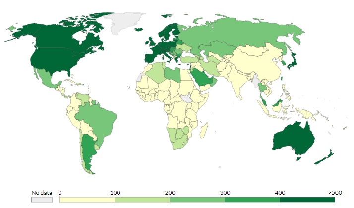 다음 표는 지역별 자동차 소유율을 세계에서 가장 높은 자동차 보급률을 보이는 국가 중 하나인 미국과 비교하여 1999년부터 2016년까지 어떻게 변화했는지를 보여준다.지역별 자동차 보급률 비교